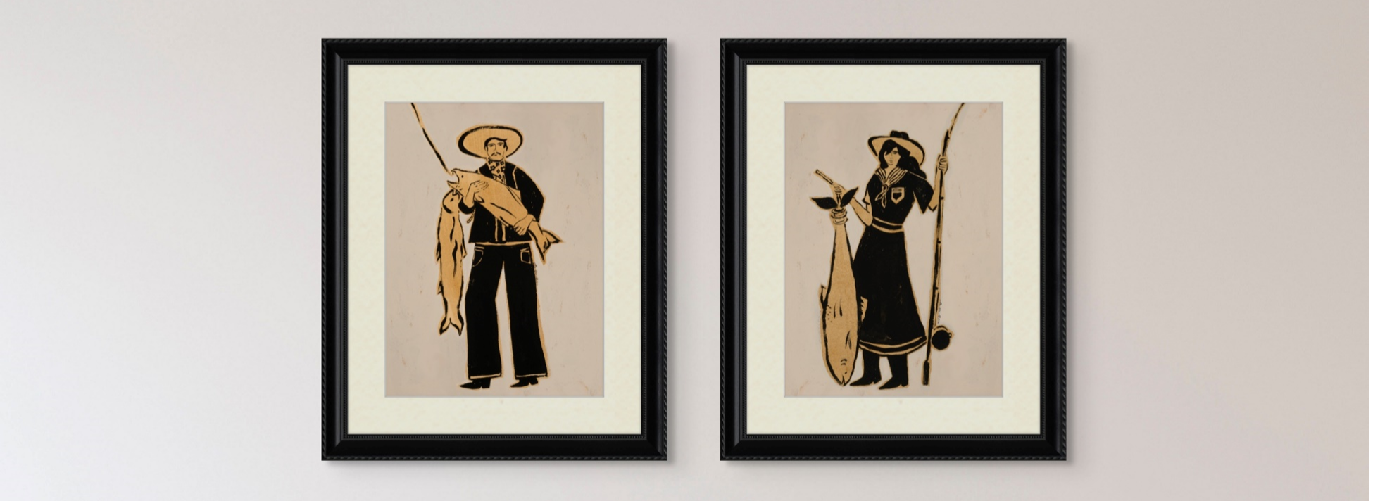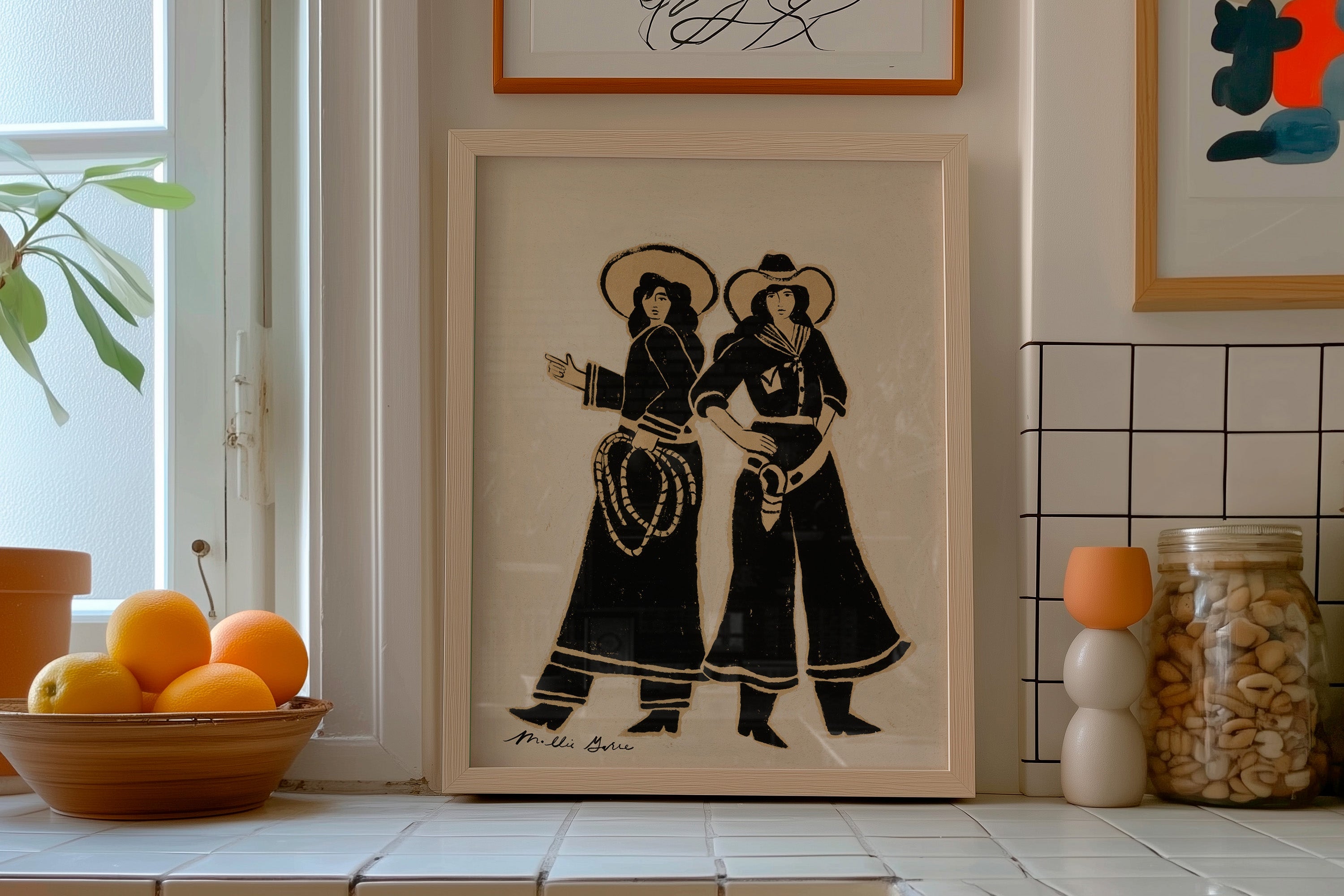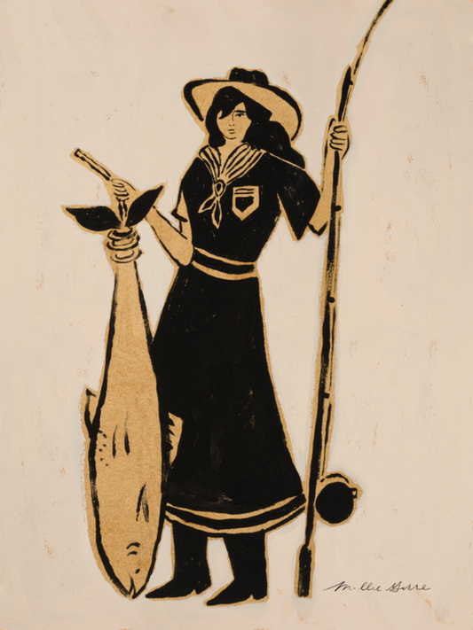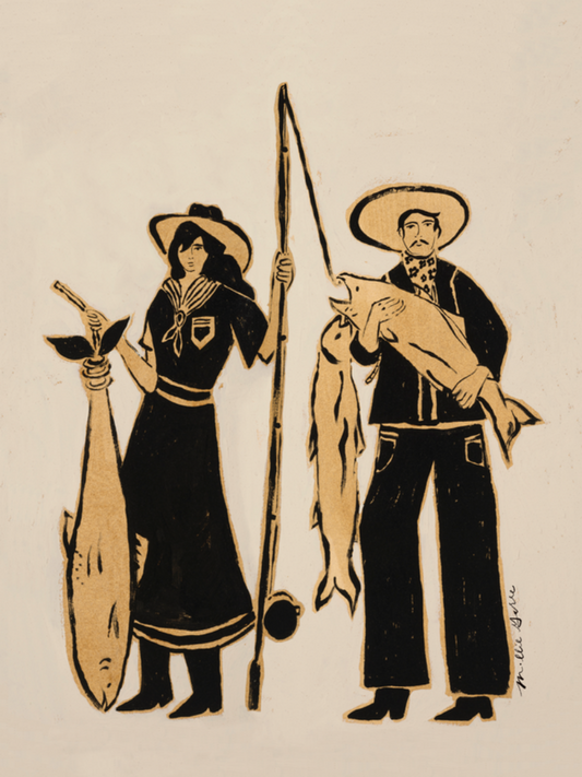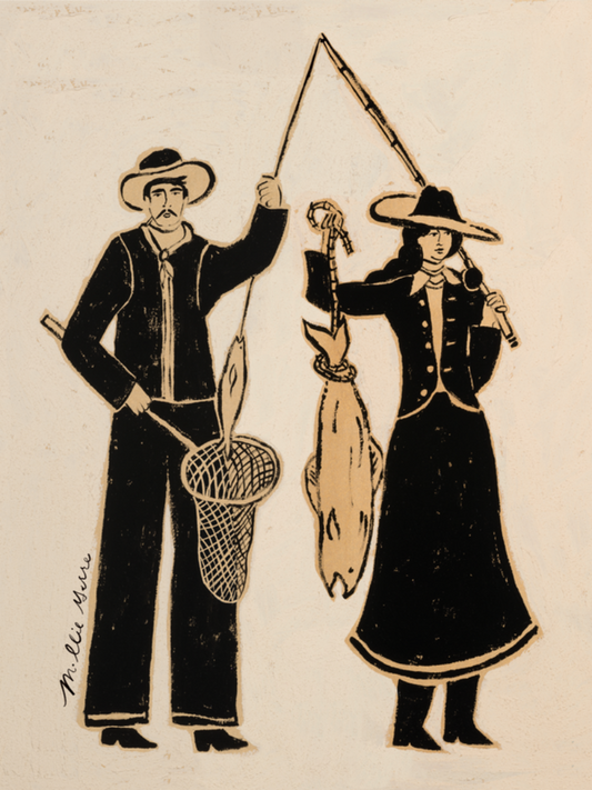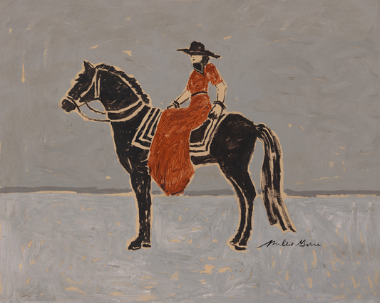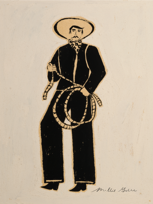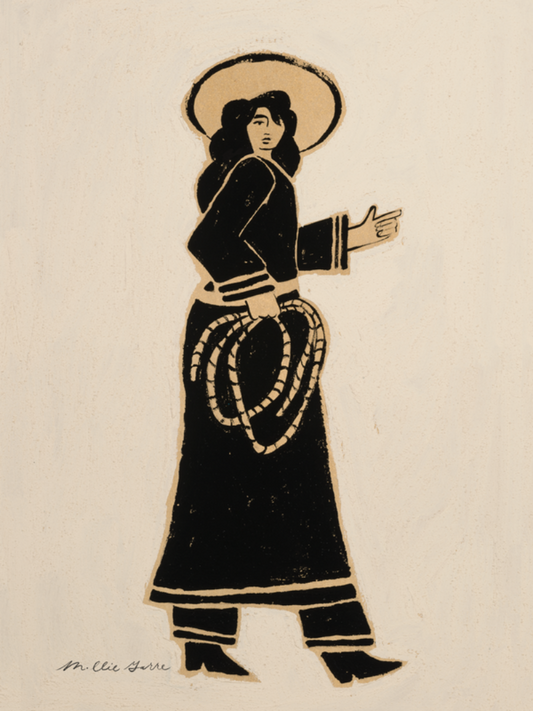 A modern celebration of the Wild West. With the boldness of black against a creamy, textured background, each person is depicted to show power and strength through both feminine lines and a strong presence.