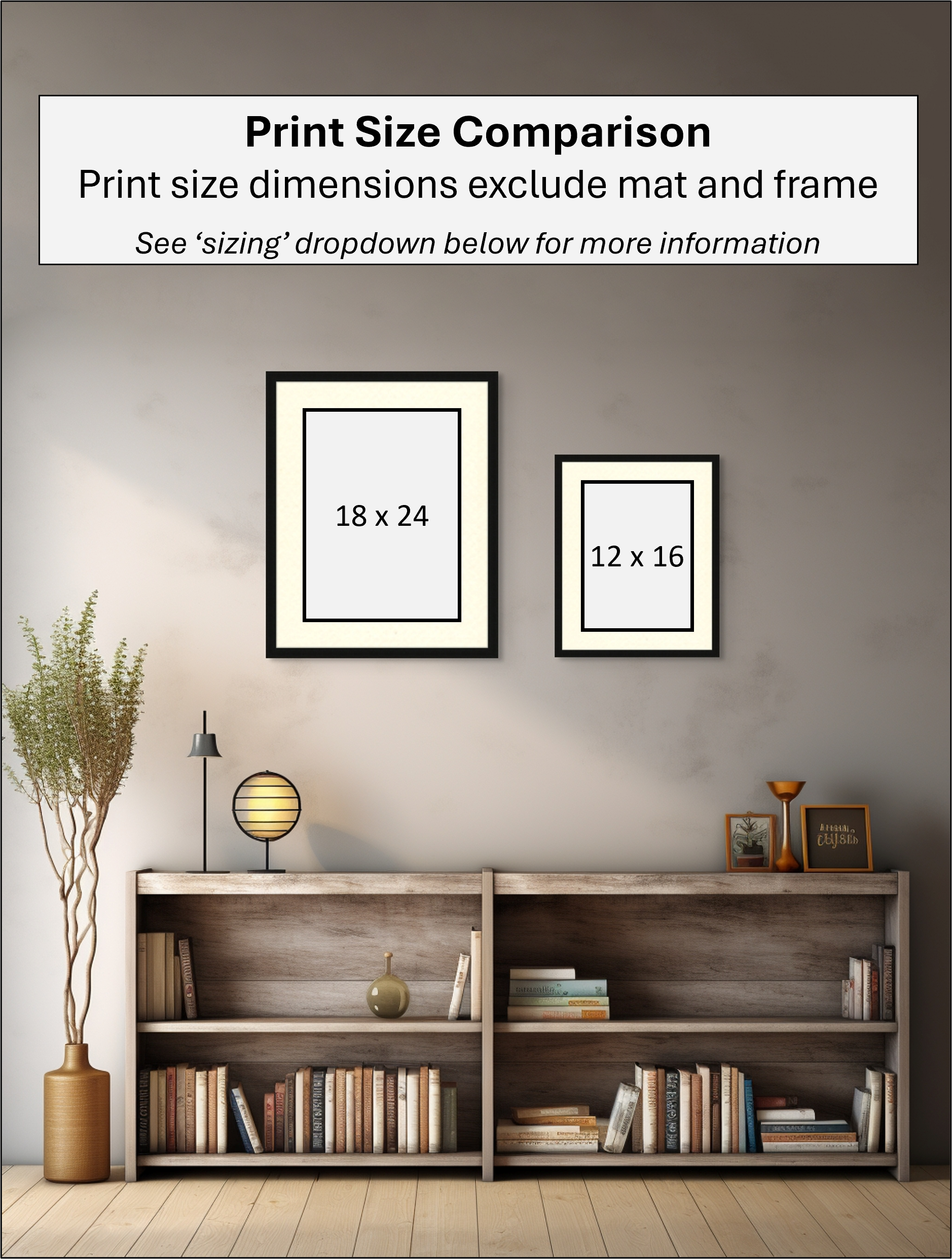 Consideramos el arte como una inversión y lo tratamos como tal. Las impresiones enmarcadas se sujetan en bandejas de tamaño personalizado con correas de plástico y se envían en cajas protectoras. ¡Consulta nuestra página de envíos para más detalles!