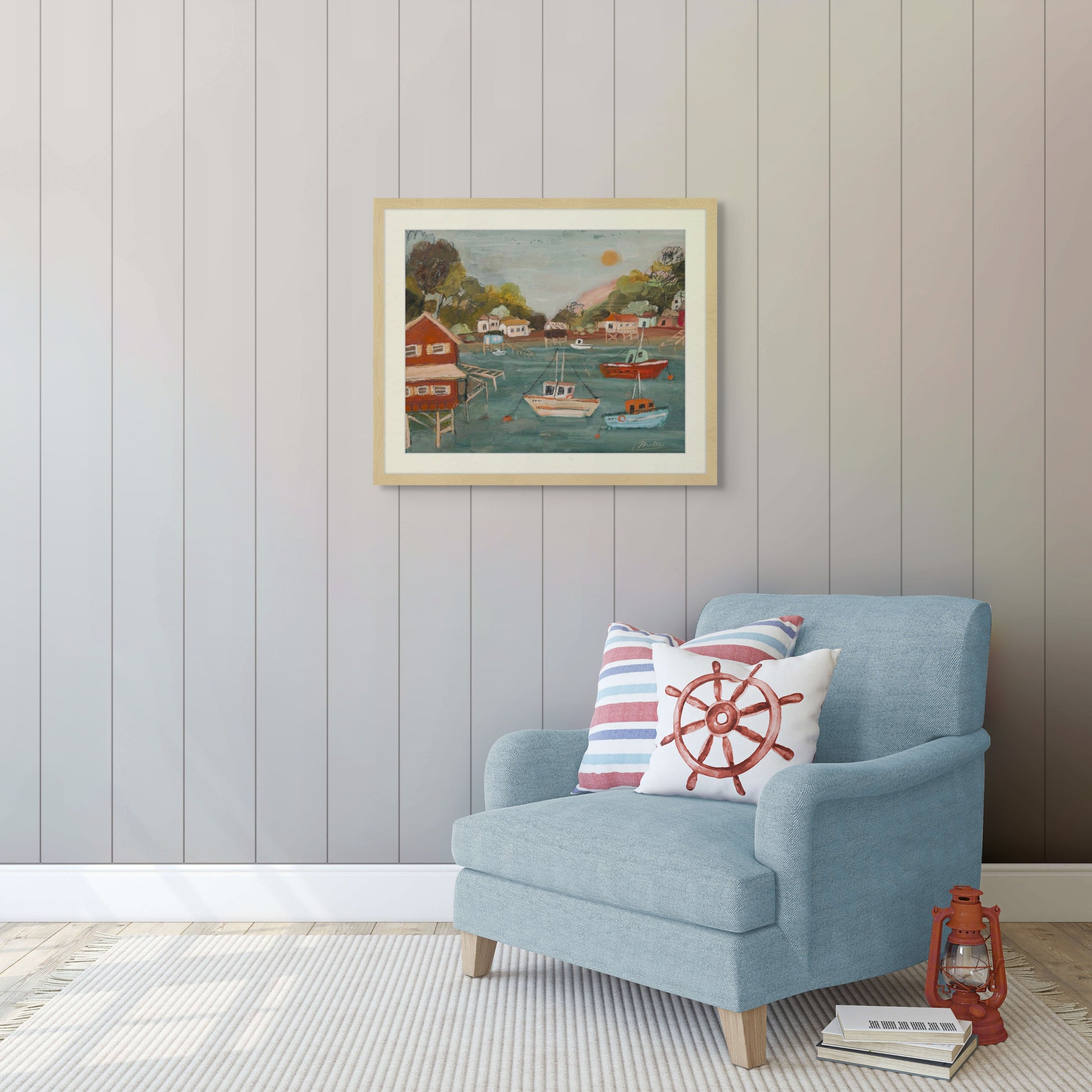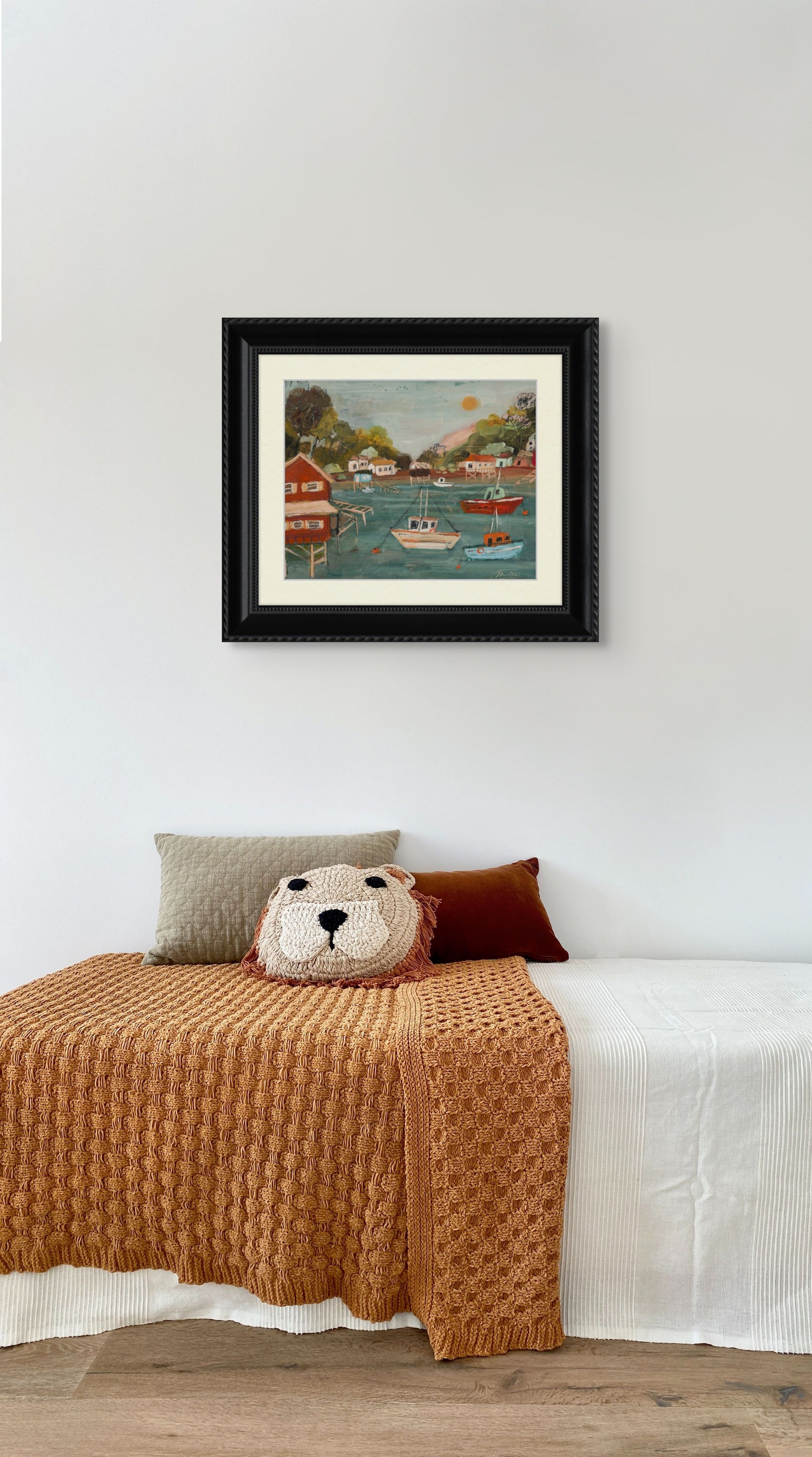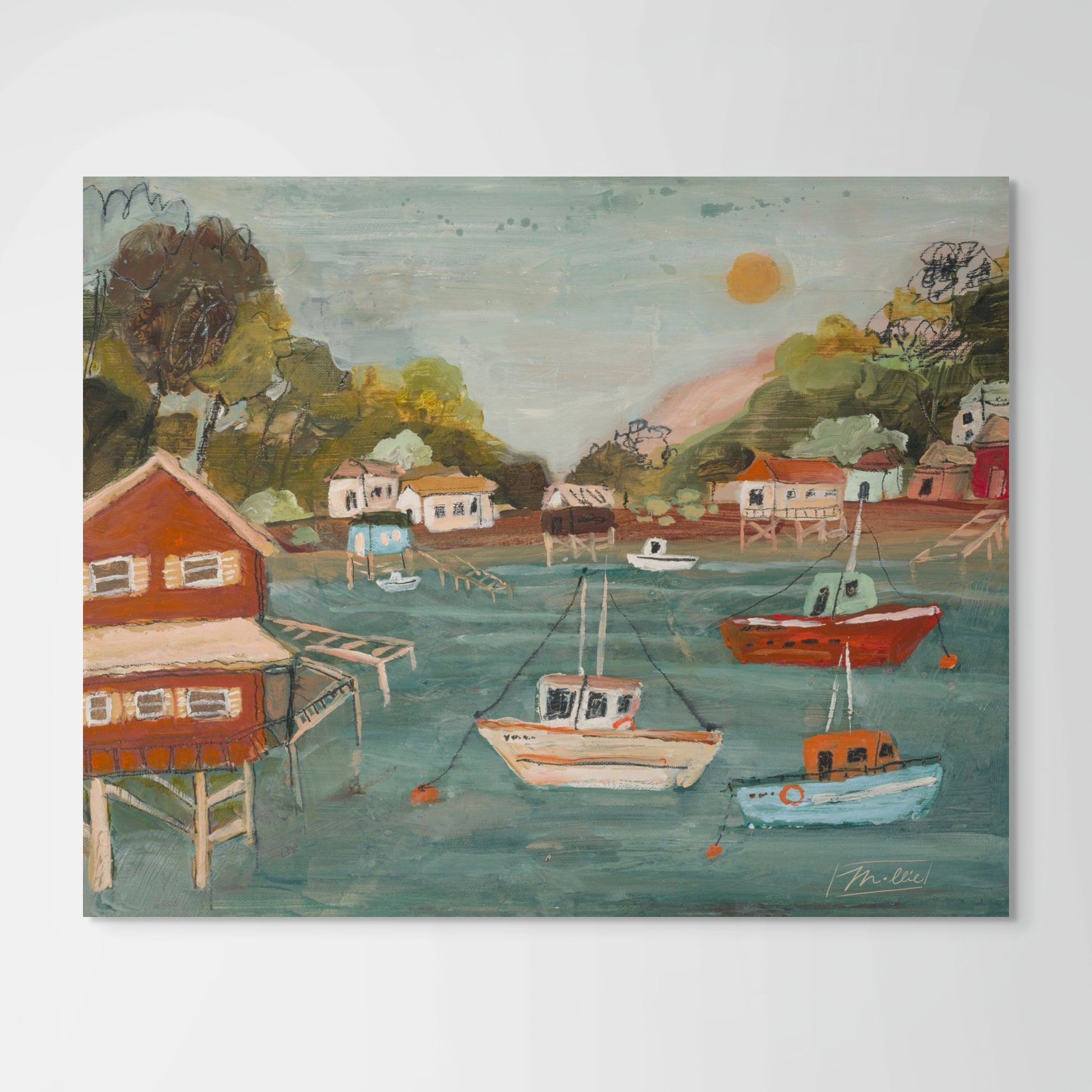 Esta pintura lúdica y de ricas capas captura el encanto de un pequeño pueblo portuario a través de una perspectiva caprichosa. Con cabañas delicadamente alineadas a lo largo de la orilla, árboles irregulares que se ciernen sobre la superficie y tonos de inspiración vintage, se siente como un pueblo costero de cuento de hadas que cobra vida. El acrílico de textura densa aporta profundidad y carácter, invitándote a extender la mano, explorar sus encantadores cobertizos e imaginarte paseando por su acogedor puerto bañado por la lluvia. Es un lugar que se siente a la vez familiar y onírico: un pequeño mundo en el que podrías entrar con gusto y quedarte un rato.