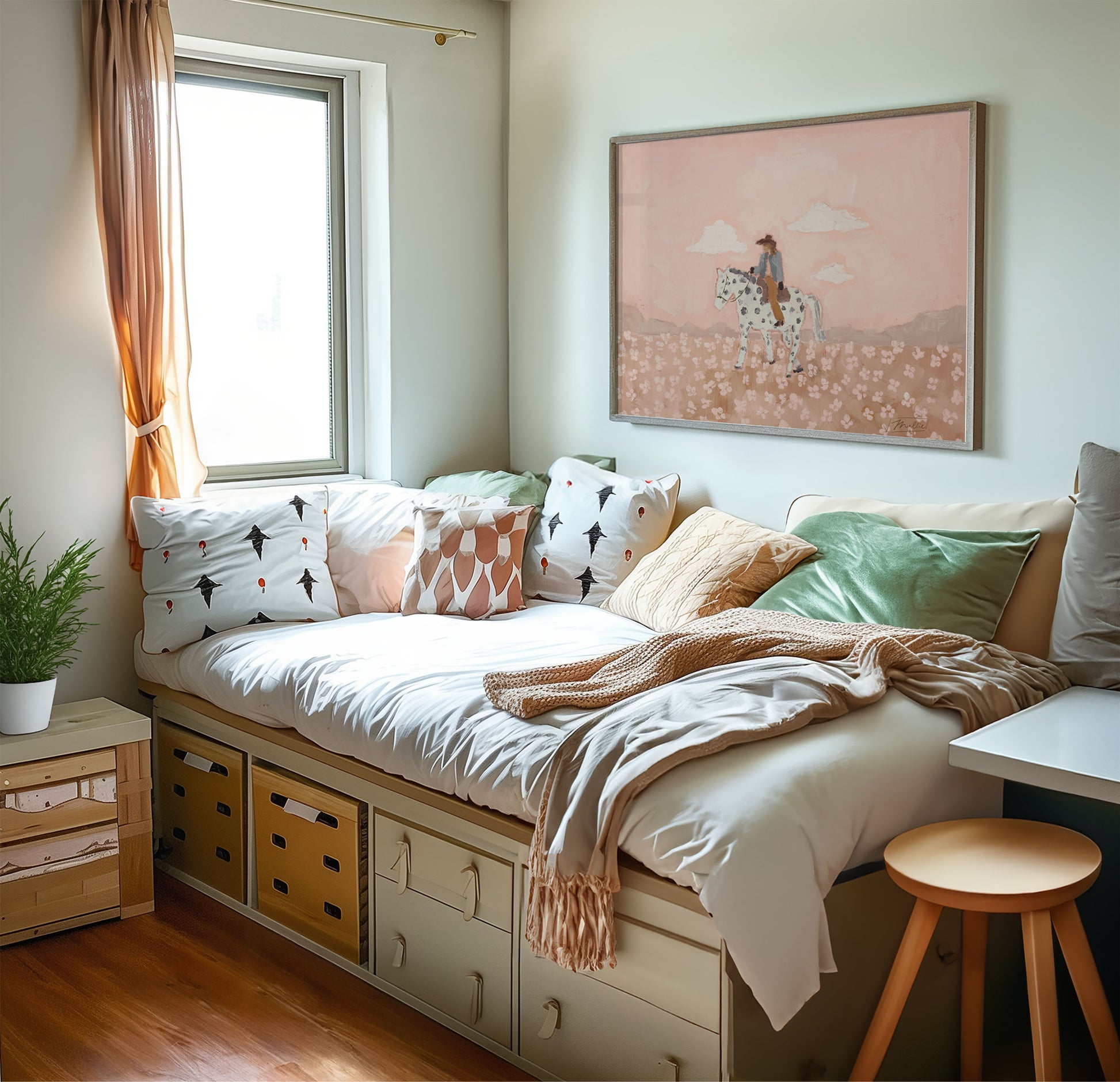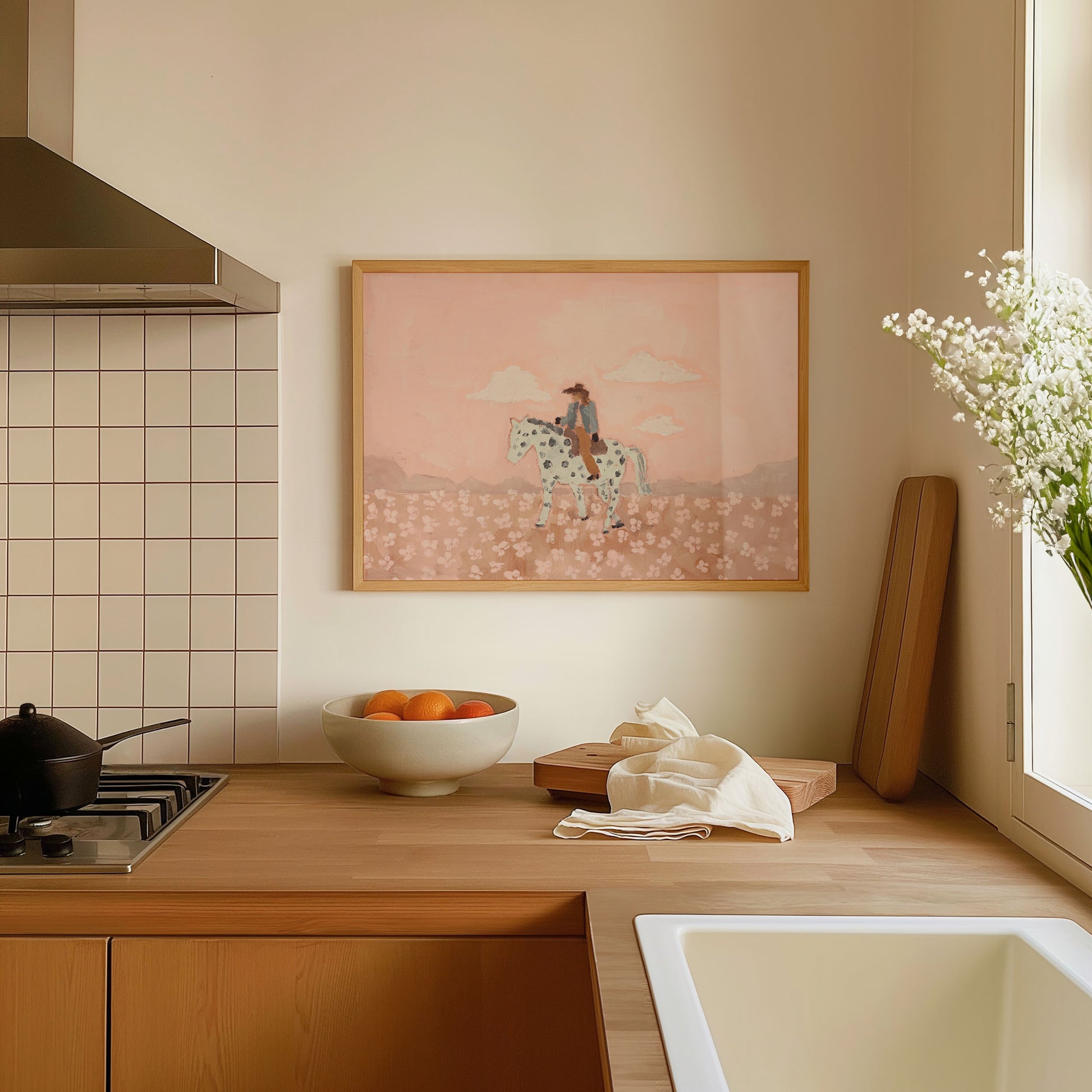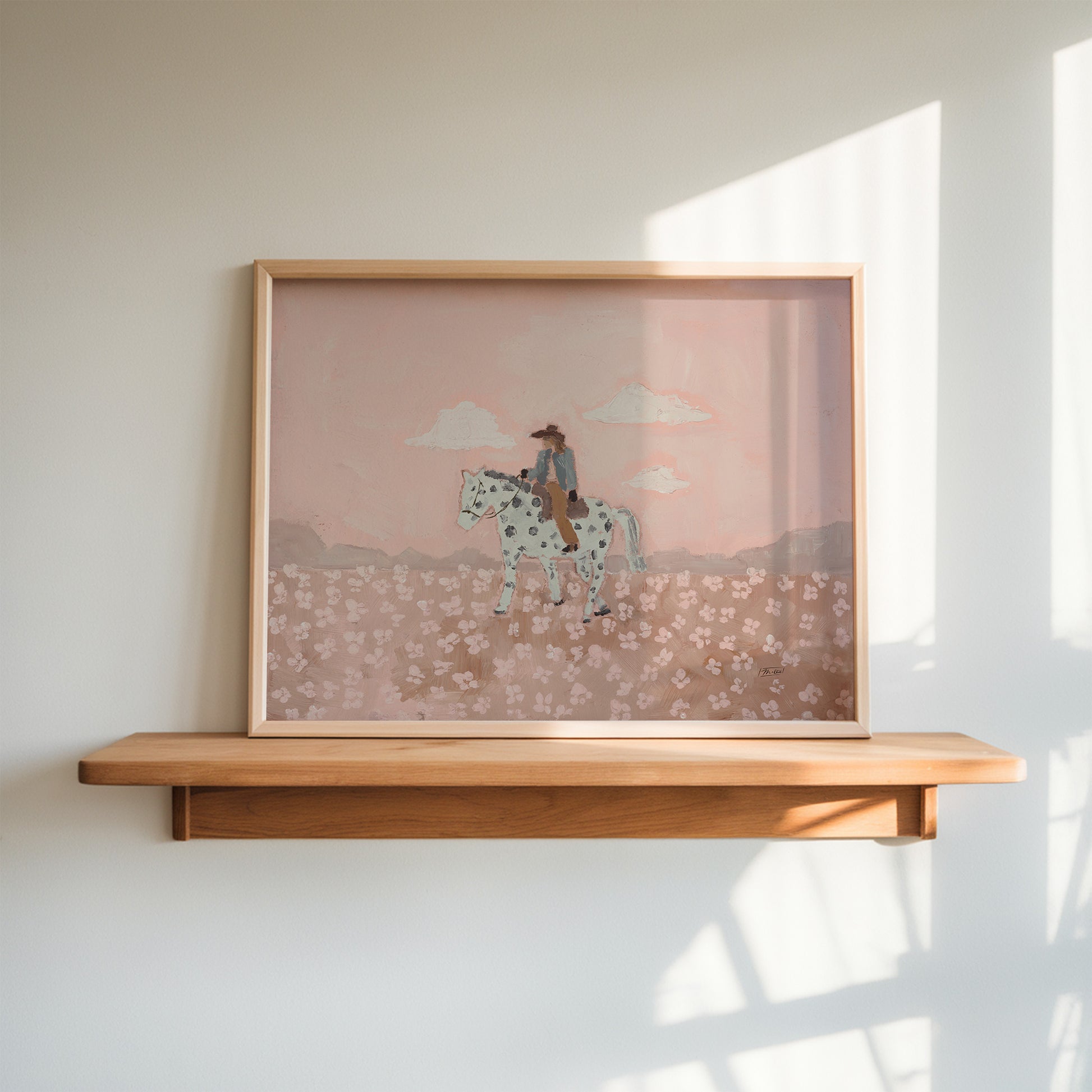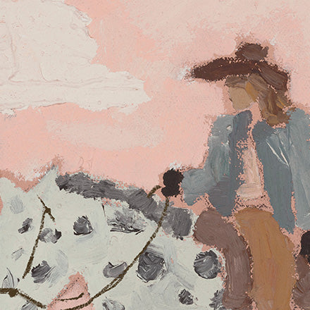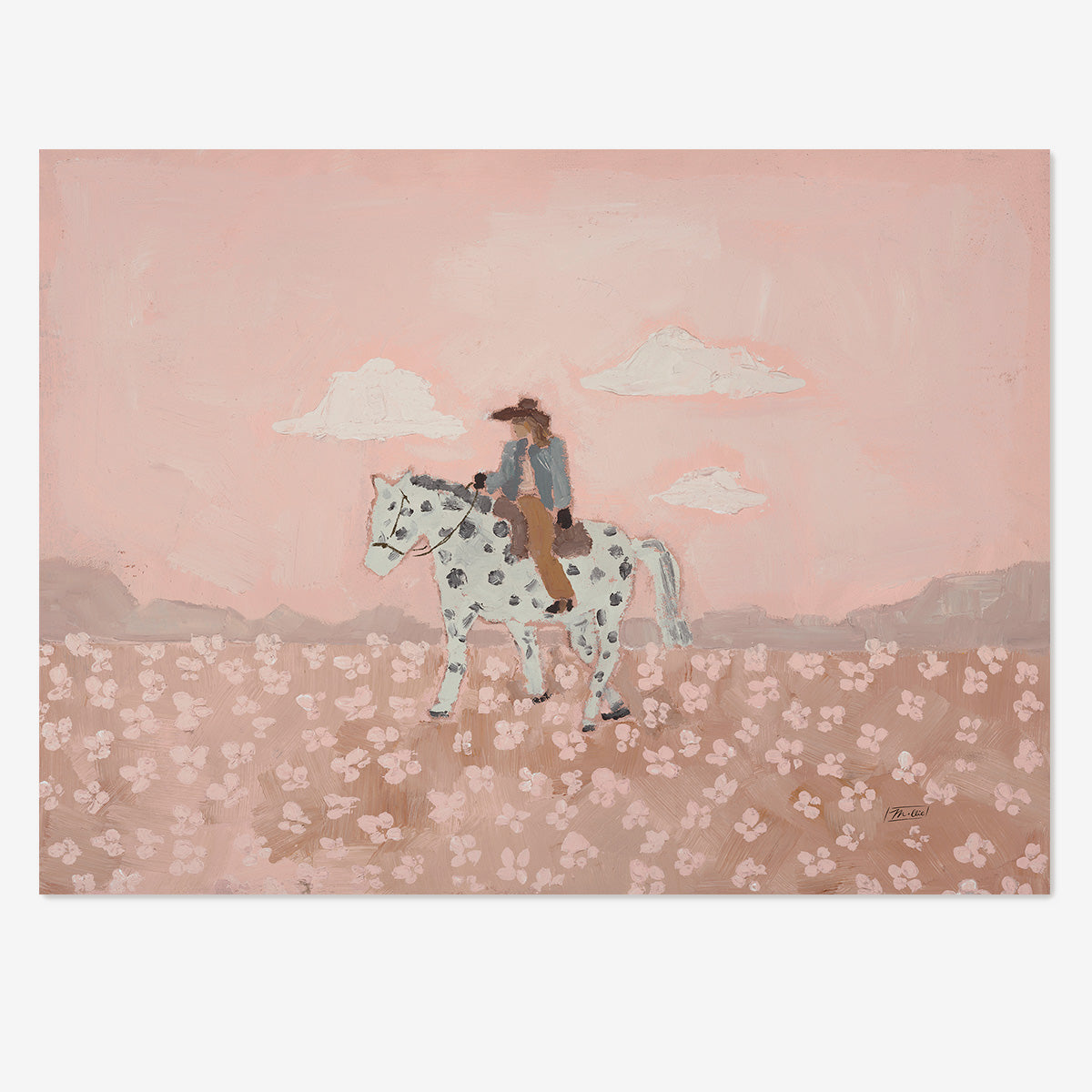 « Giddy Up Buttercup » est une joyeuse célébration de la féminité et de la liberté. Un cheval fantasque porte une cavalière assurée à travers un champ de fleurs épanouies, baigné de douces teintes roses qui évoquent la force, la beauté et une féminité assumée. Cette œuvre capture ce mélange magique de grâce et d'audace, cette sensation d'avancer avec une curiosité insatiable, puisant sa force dans un esprit à la fois doux et puissant.