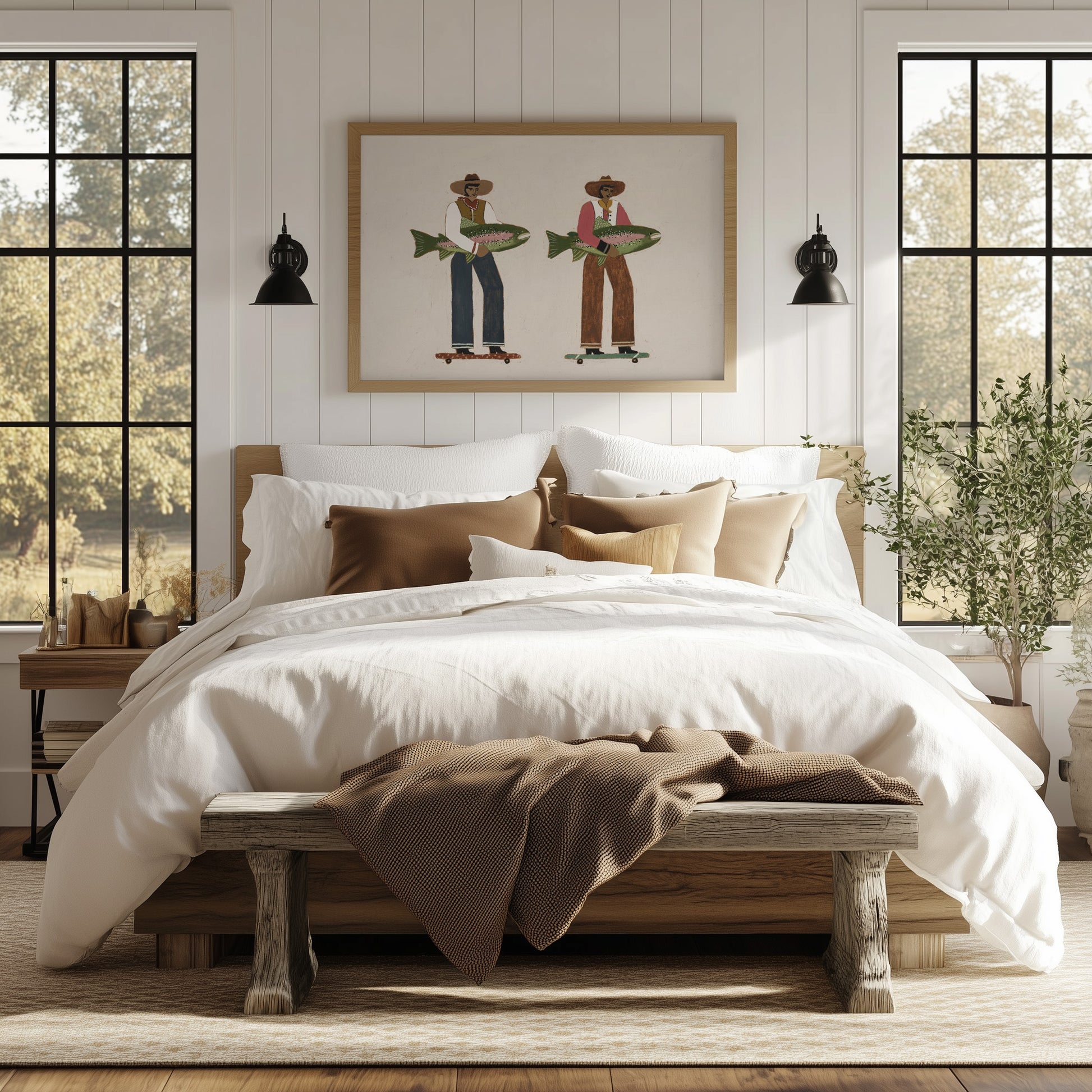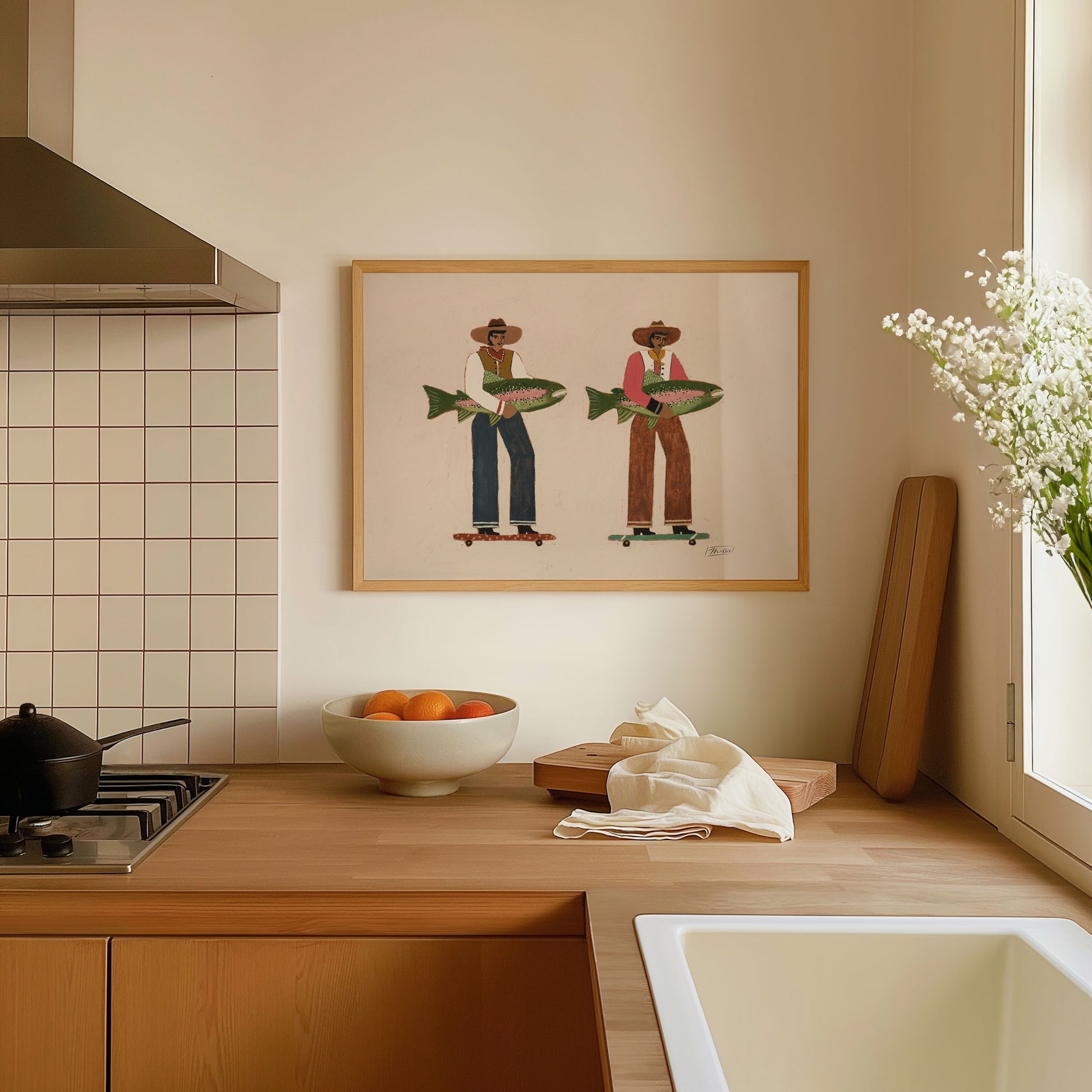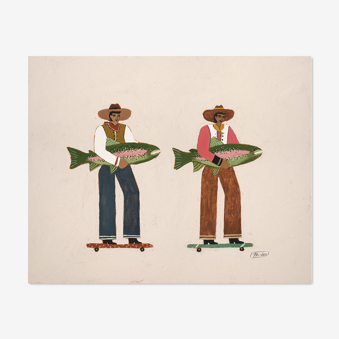 Surf & Turf célèbre la folle aventure de la vie, deux hommes qui avancent avec une aisance naturelle, leurs prises à la main, la route s'étendant à perte de vue. C'est un hommage à l'élan, au mouvement, à la traversée du monde côte à côte. Mélange de force, d'humour et de charme côtier, cette œuvre capture le sentiment de tracer son propre chemin tout en restant connecté à ses racines.