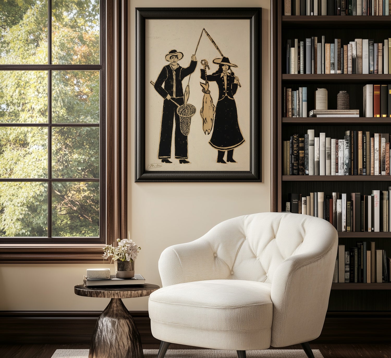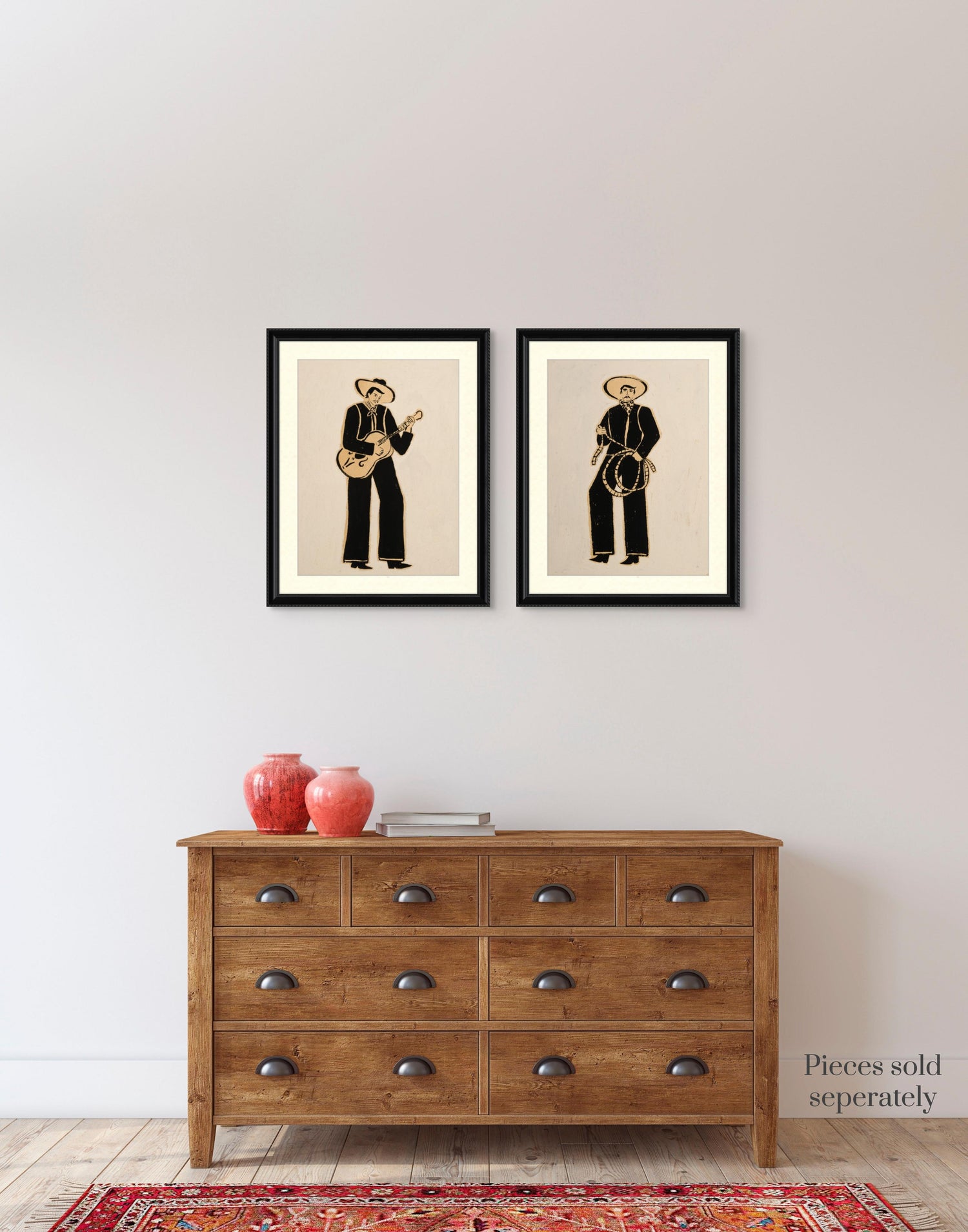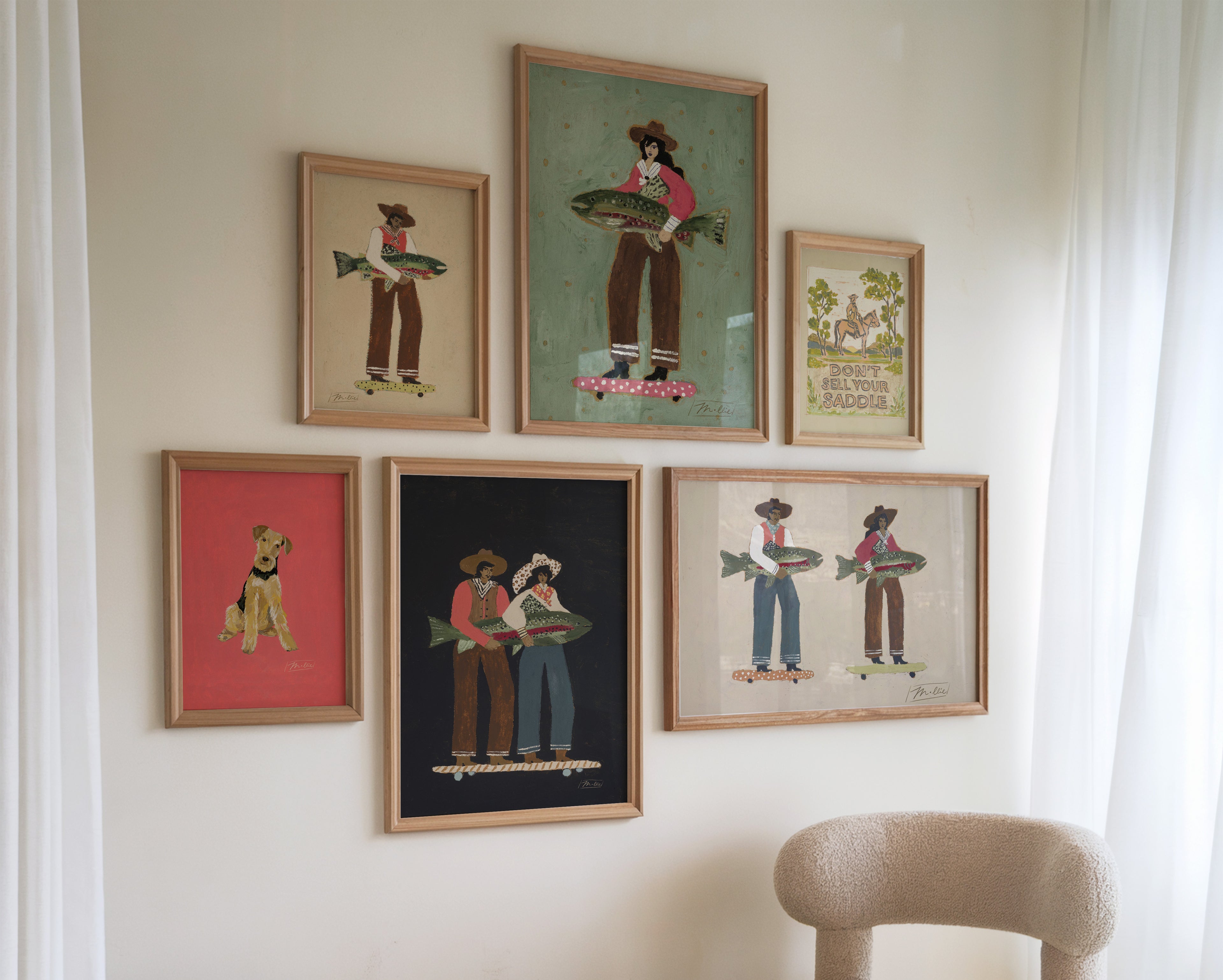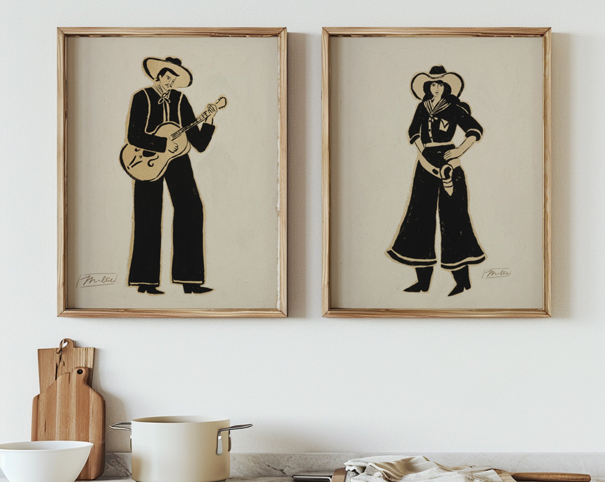 A modern celebration of the Wild West. With the boldness of black against a creamy, textured background, each person is depicted to show power and strength through both feminine lines and a strong presence.