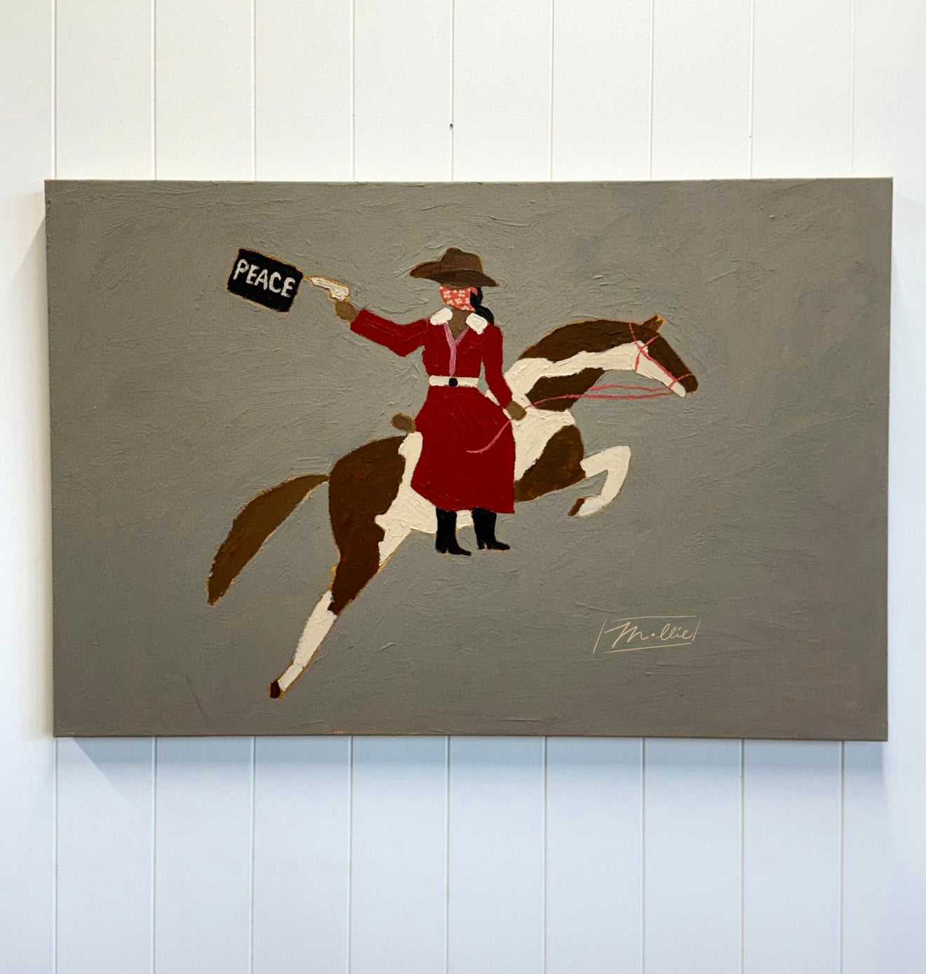 A woman on horseback defends her peace with quiet strength. Balanced precariously sidesaddle, she radiates calm confidence. She’s untouchable, yet graceful.