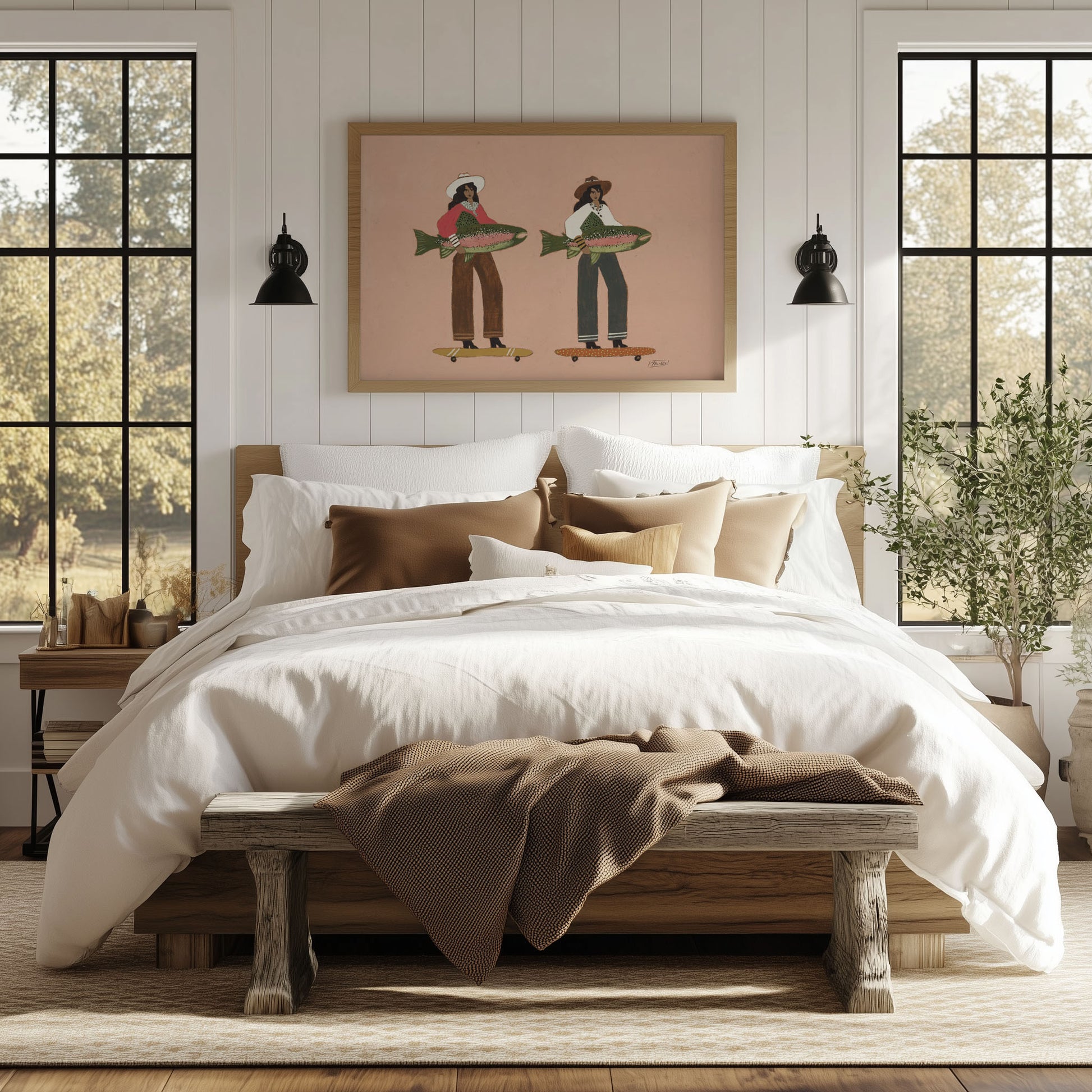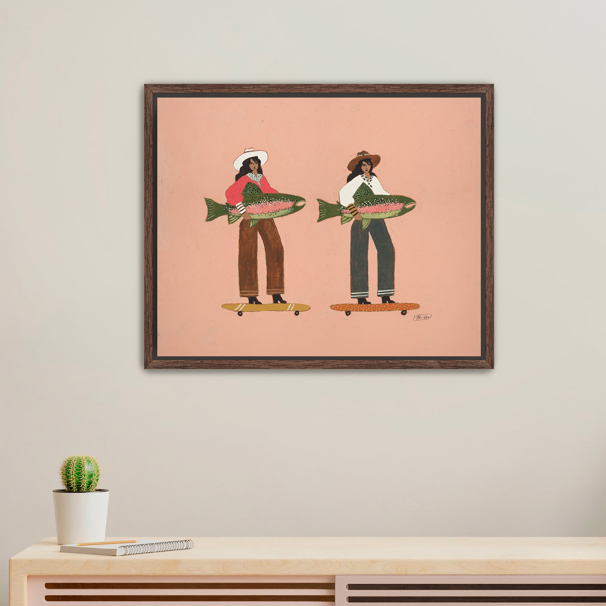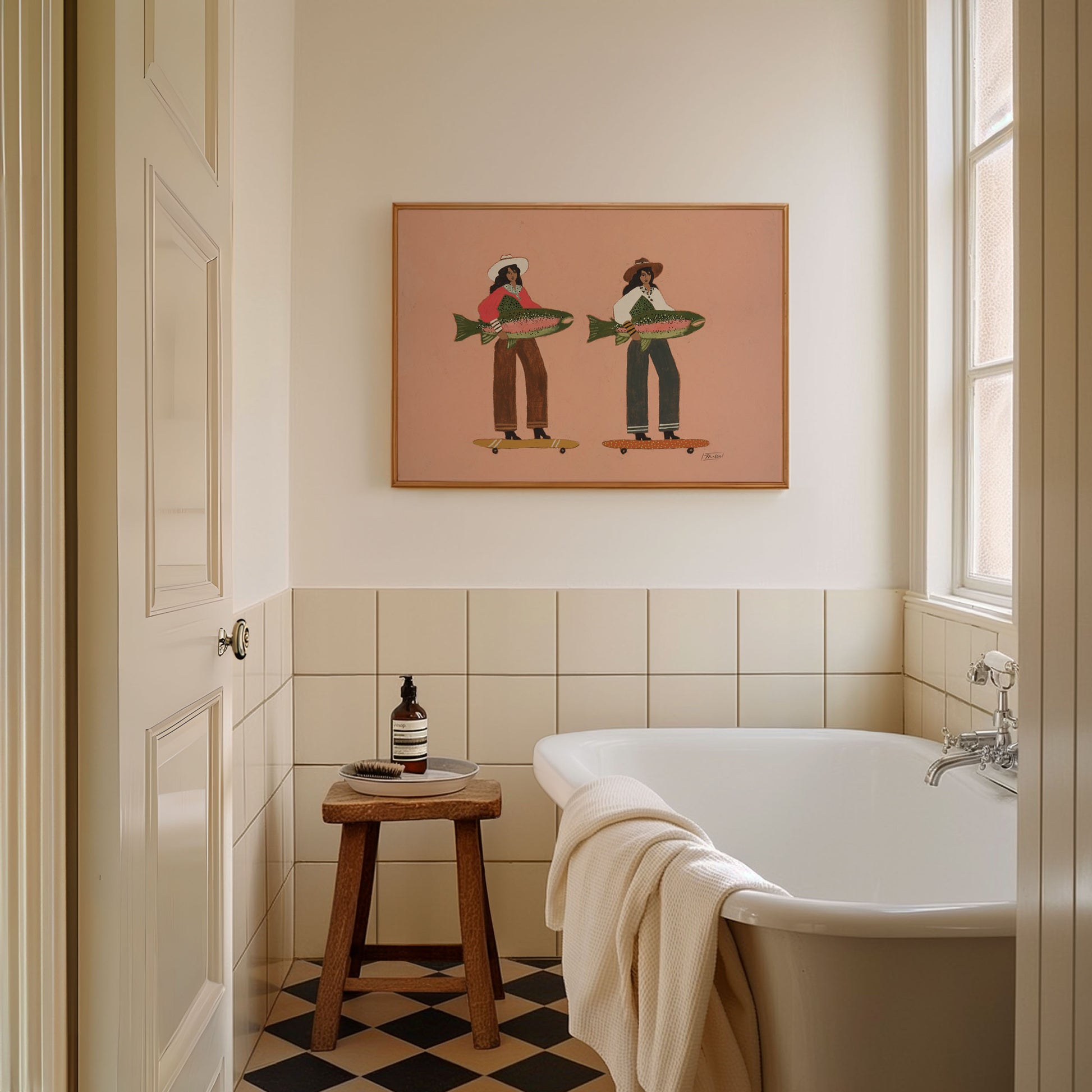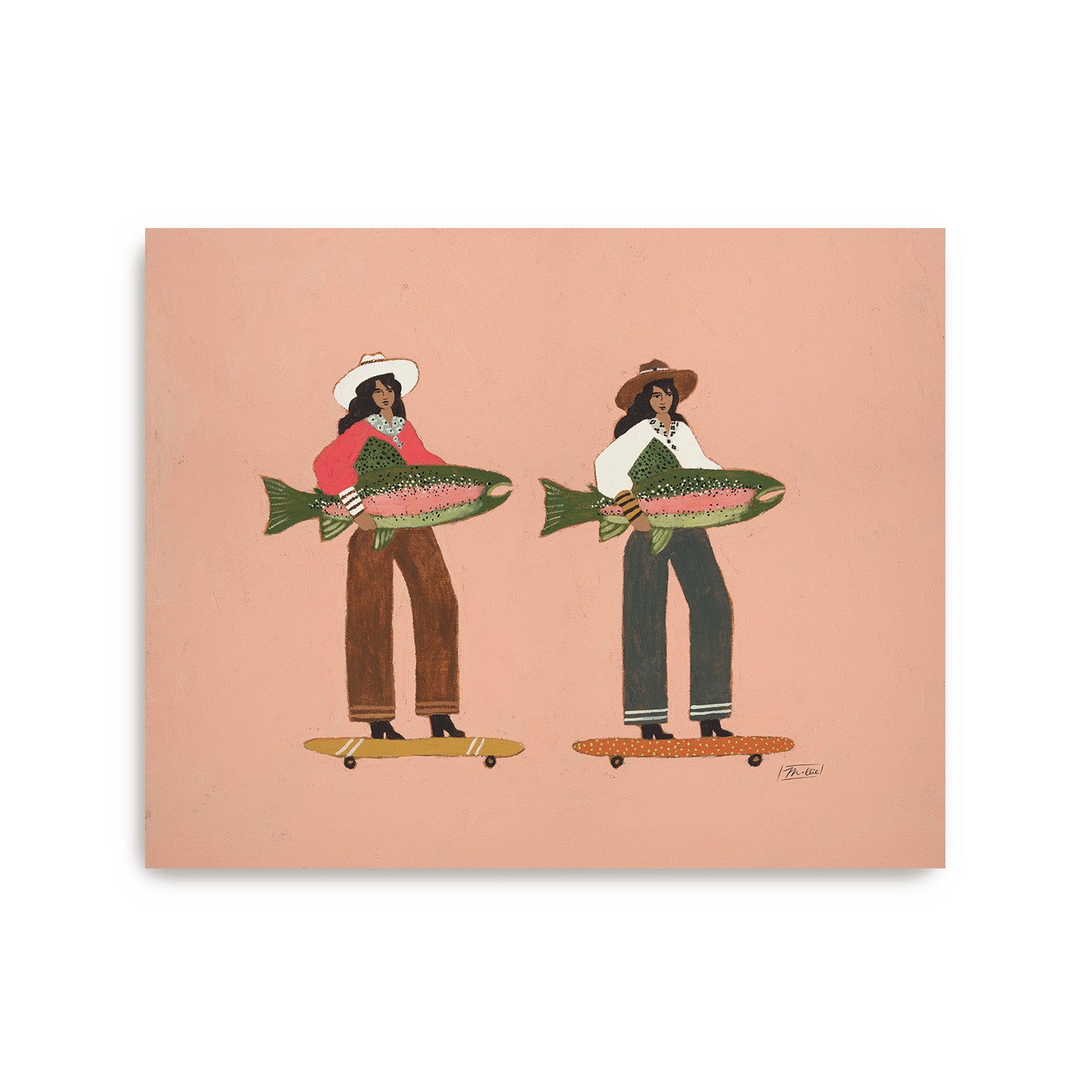 These two roll through life with grit, grace, and a good catch in hand. Their skateboards carry them forward, but it’s their bond that keeps them steady. This piece is a tribute to bold women, belly laughs, salty air, and the wild stories we gather along the way. A celebration of being together that’s fearless, free-spirited, and wonderfully unconventional, just like the best adventures.