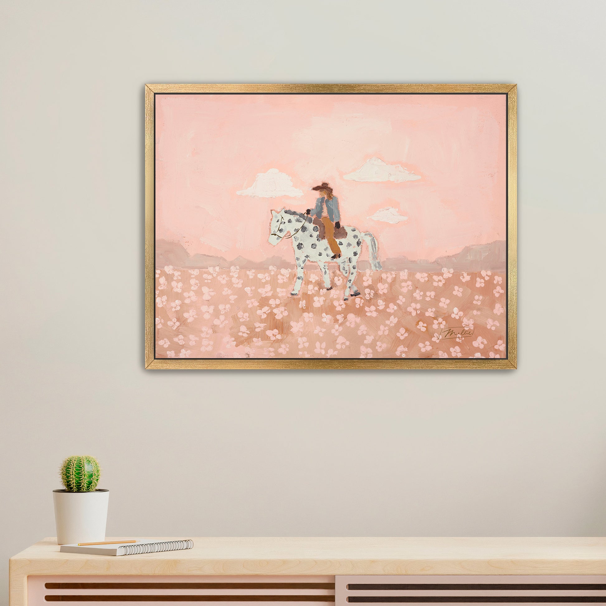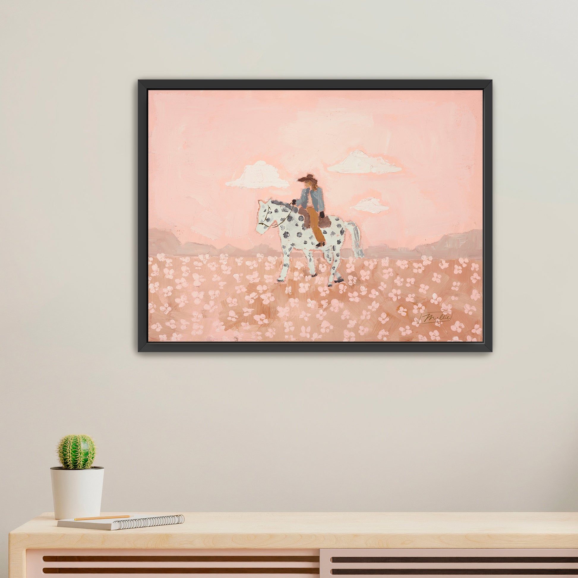 Giddy Up Buttercup is a joyful celebration of femininity and freedom. A whimsical horse carries a confident rider through a field of blooming flowers, all washed in soft pink hues that echo strength, beauty, and unapologetic womanhood. This piece captures that magical blend of grace and moxie, the feeling of moving forward with wild hearted wonder, rooted in a soft, yet powerful spirit.