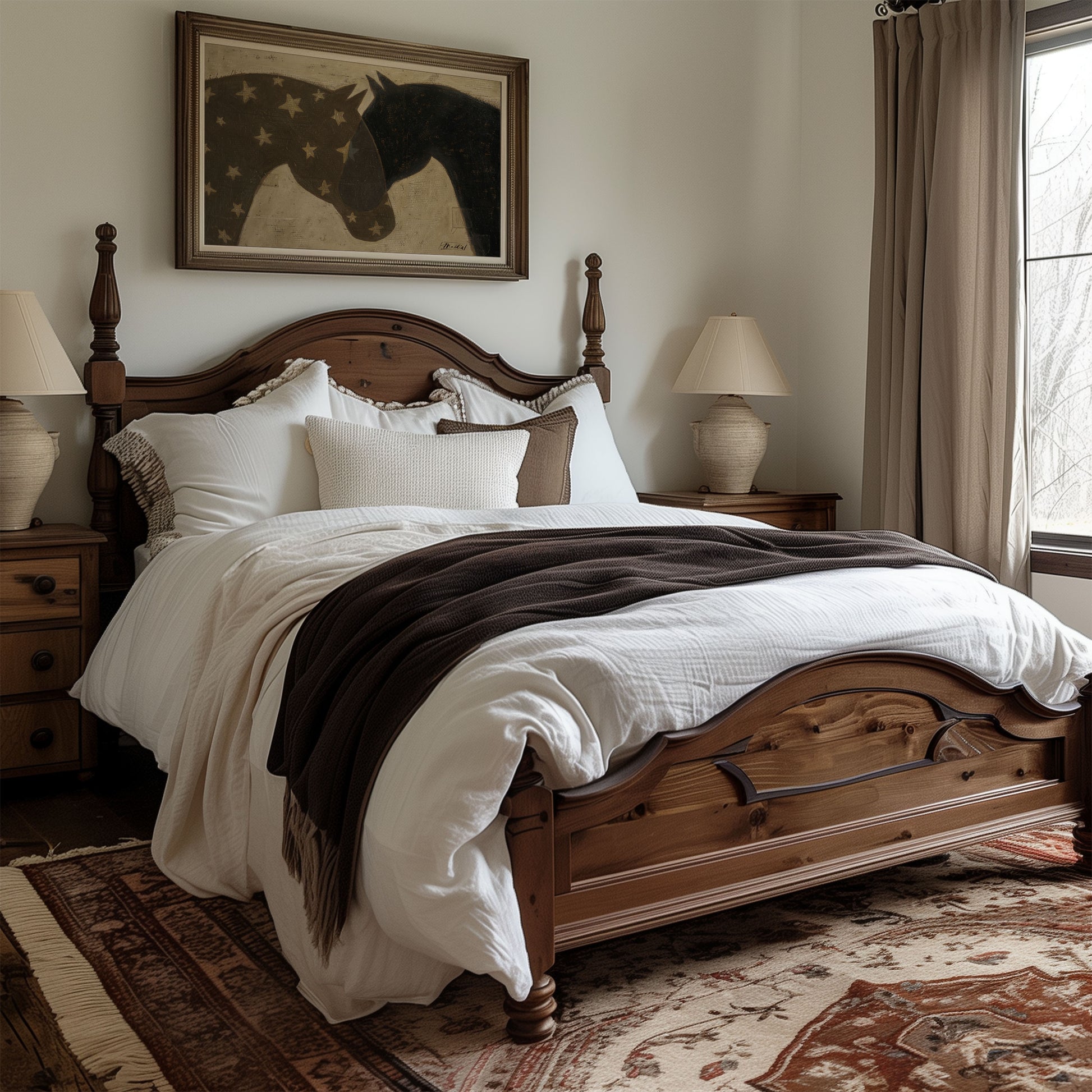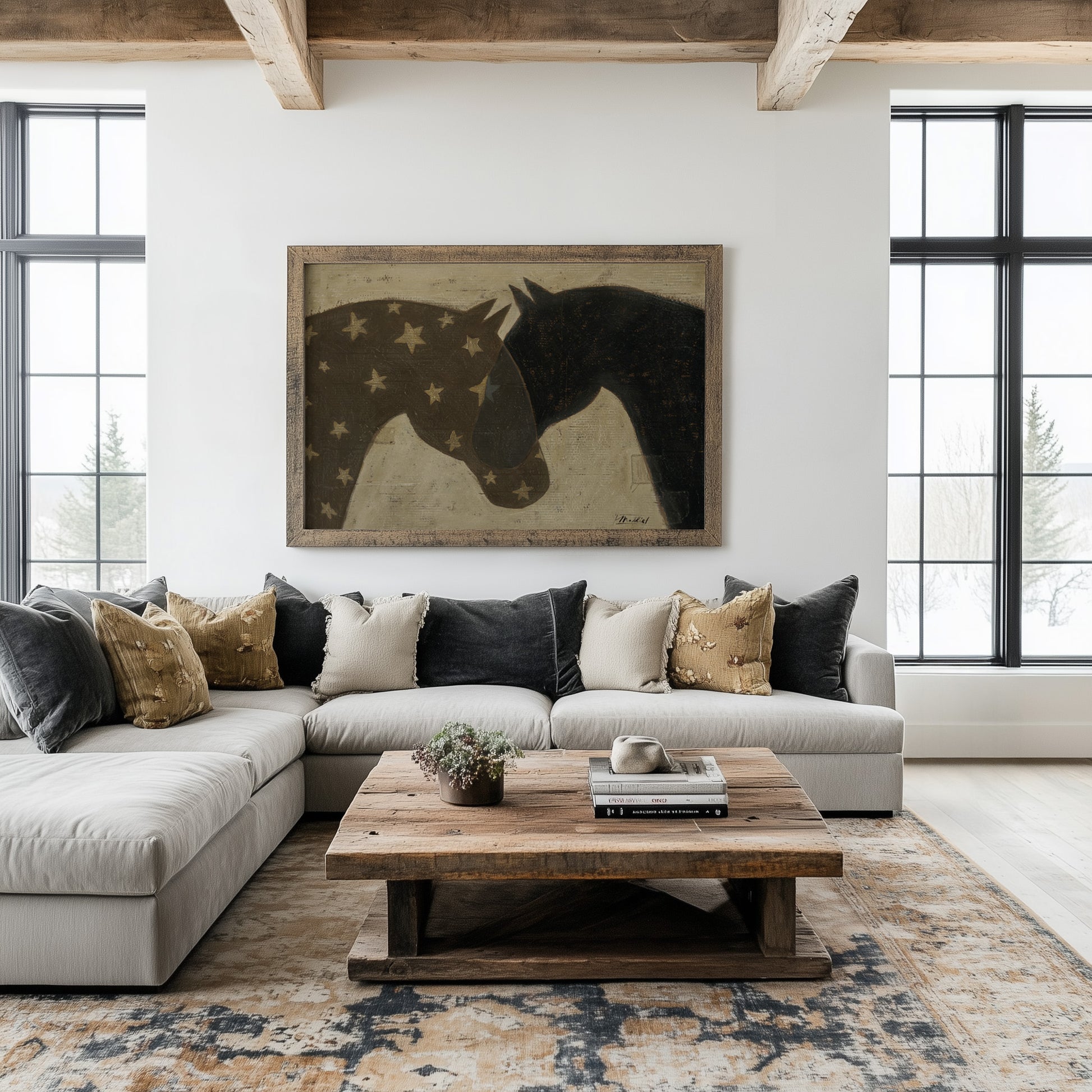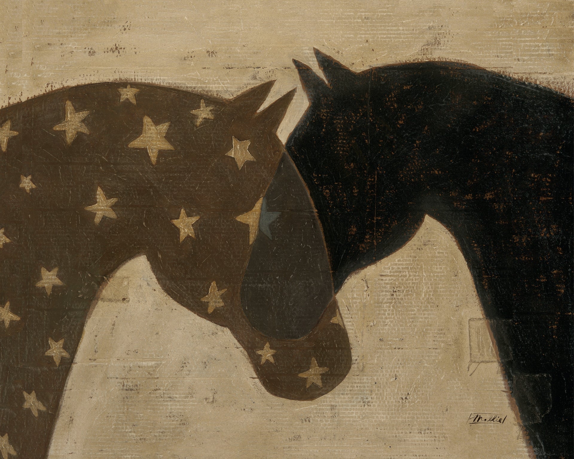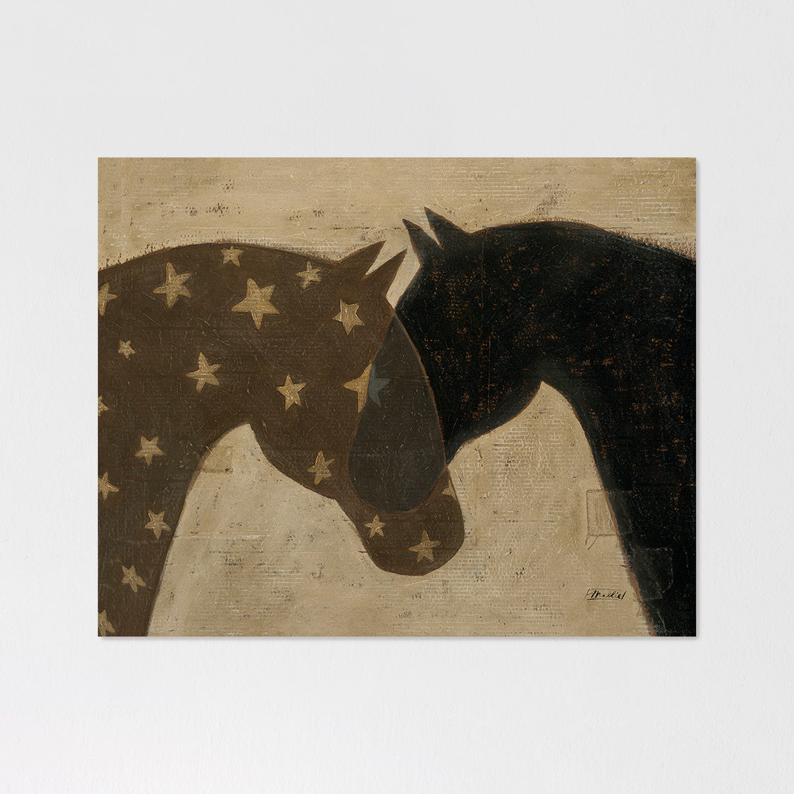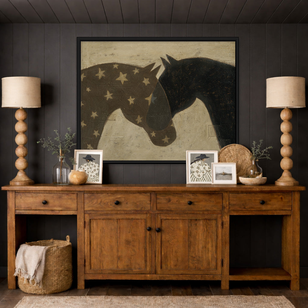 Hitched features two horses layered in quiet alignment, rendered in a palette of neutral grey, warm brown, and deep charcoal. Their overlapping forms create a sense of closeness and continuity, two beings linked, moving forward together. The composition suggests connection rather than constraint: a gentle tether, an unspoken agreement. Each horse has its own strength and presence, yet they are visually and emotionally bound, hitched by trust, shared direction, and steady resolve.