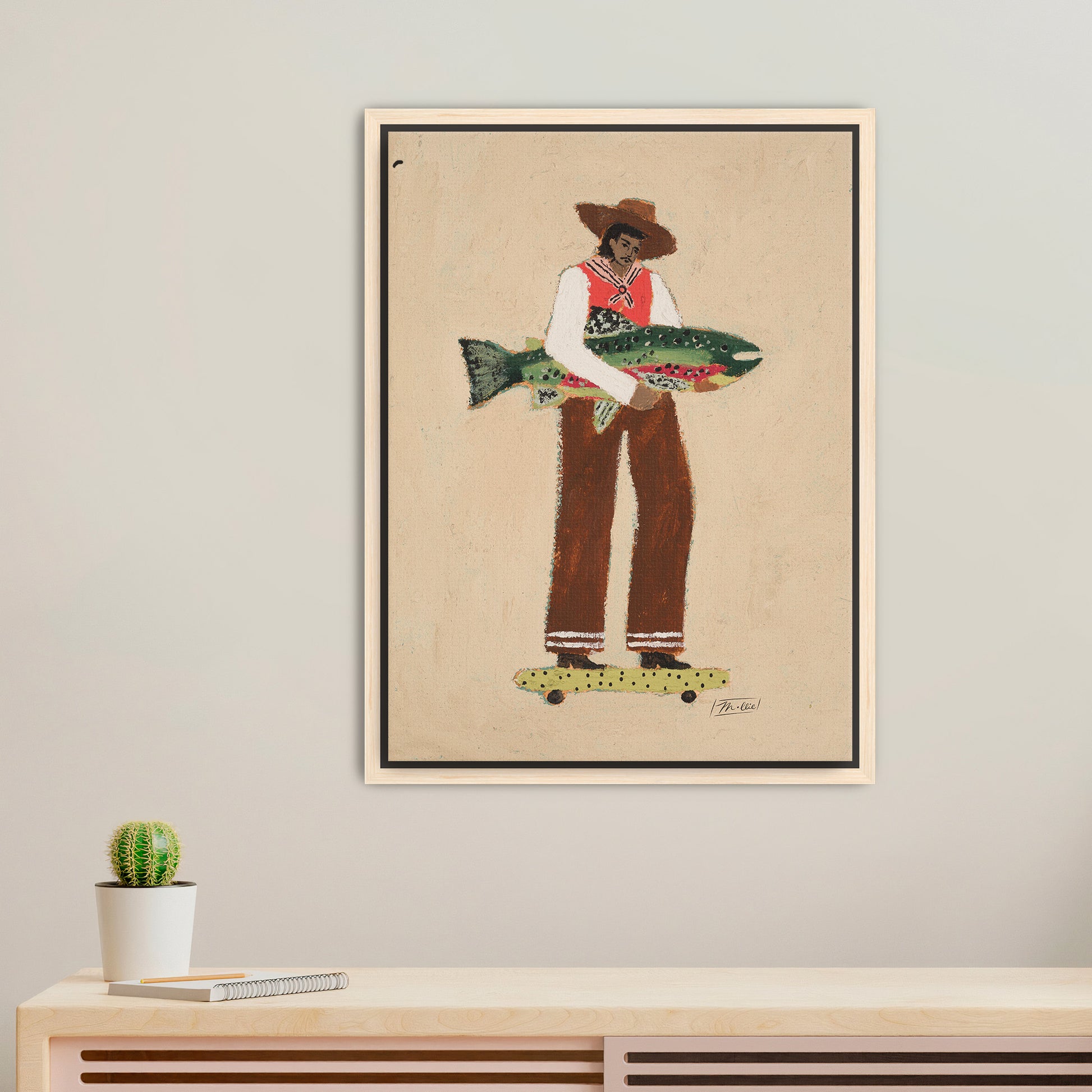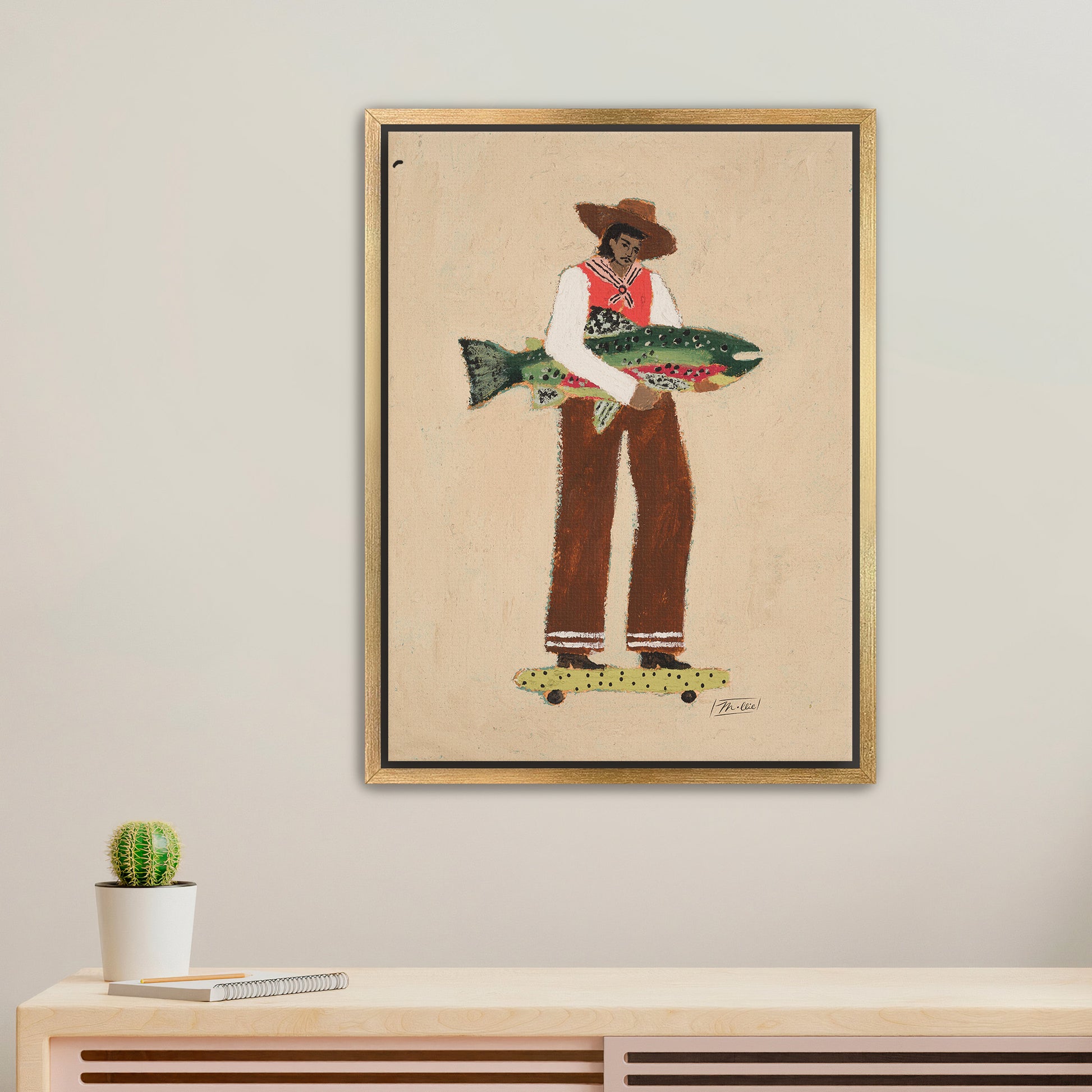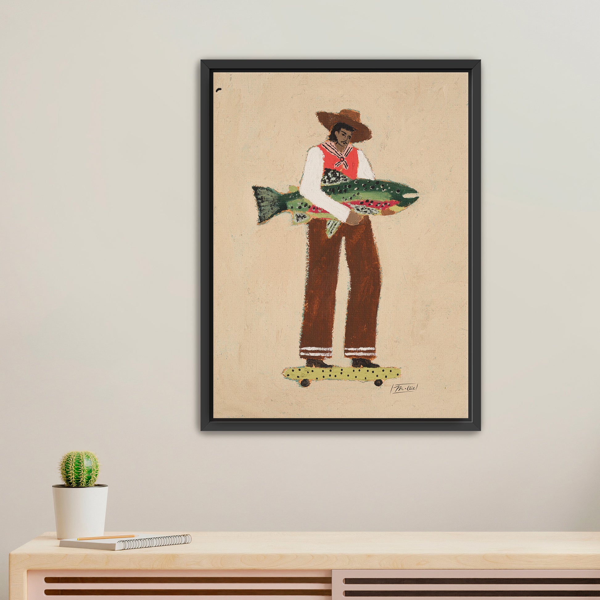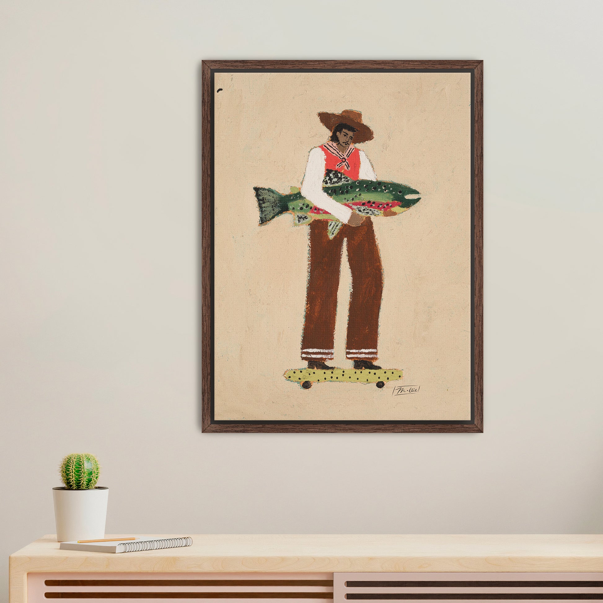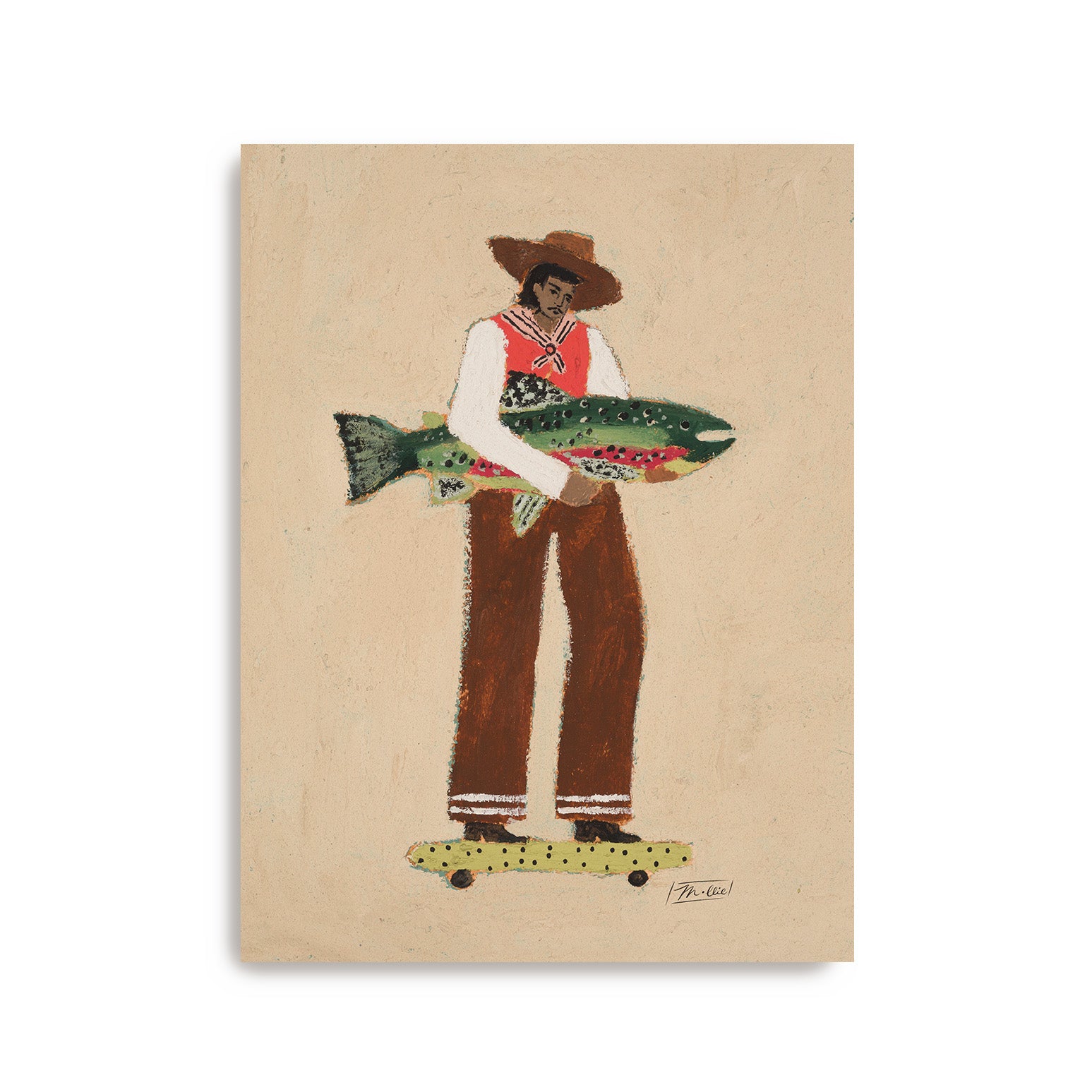 A calm, confident traveler returns from adventure, fish under his arm, skateboard underfoot, balancing it all with quiet poise.