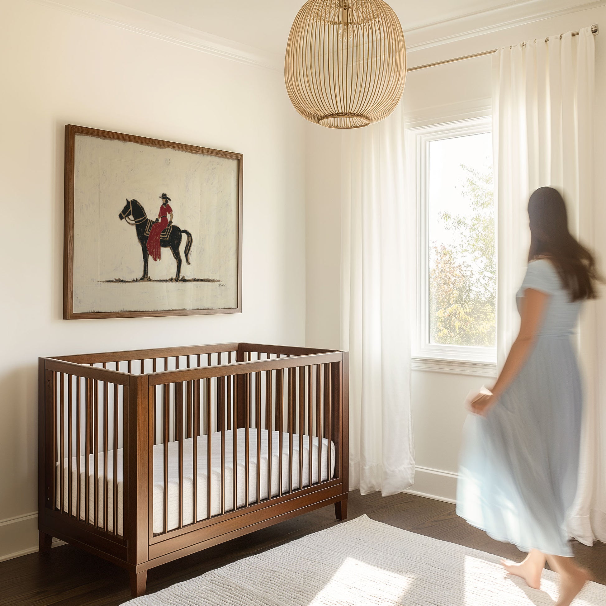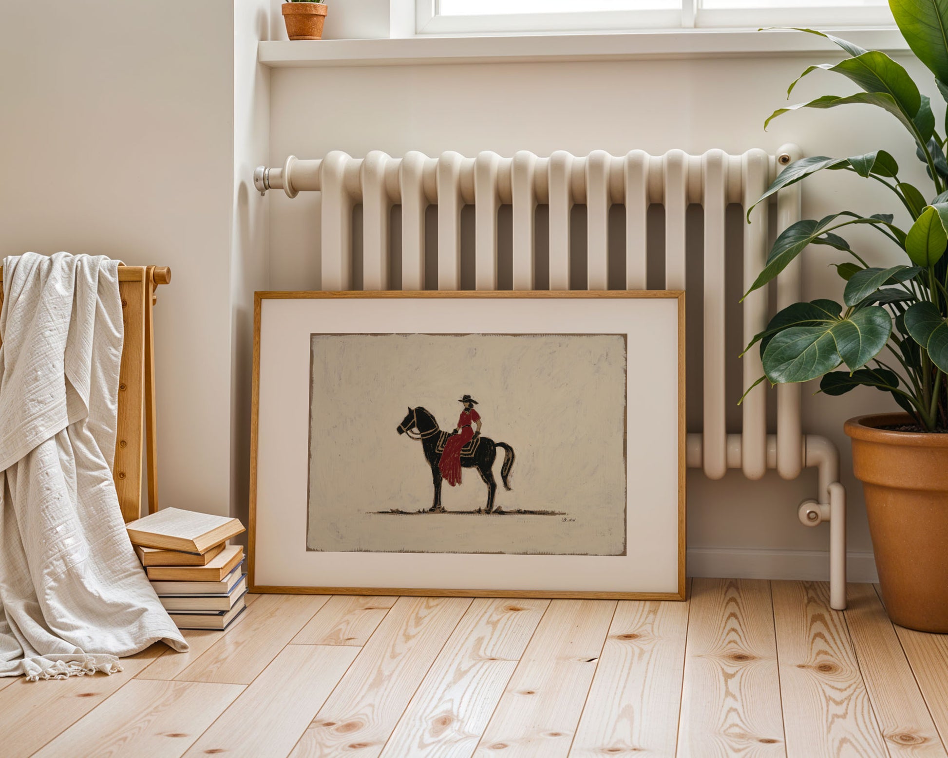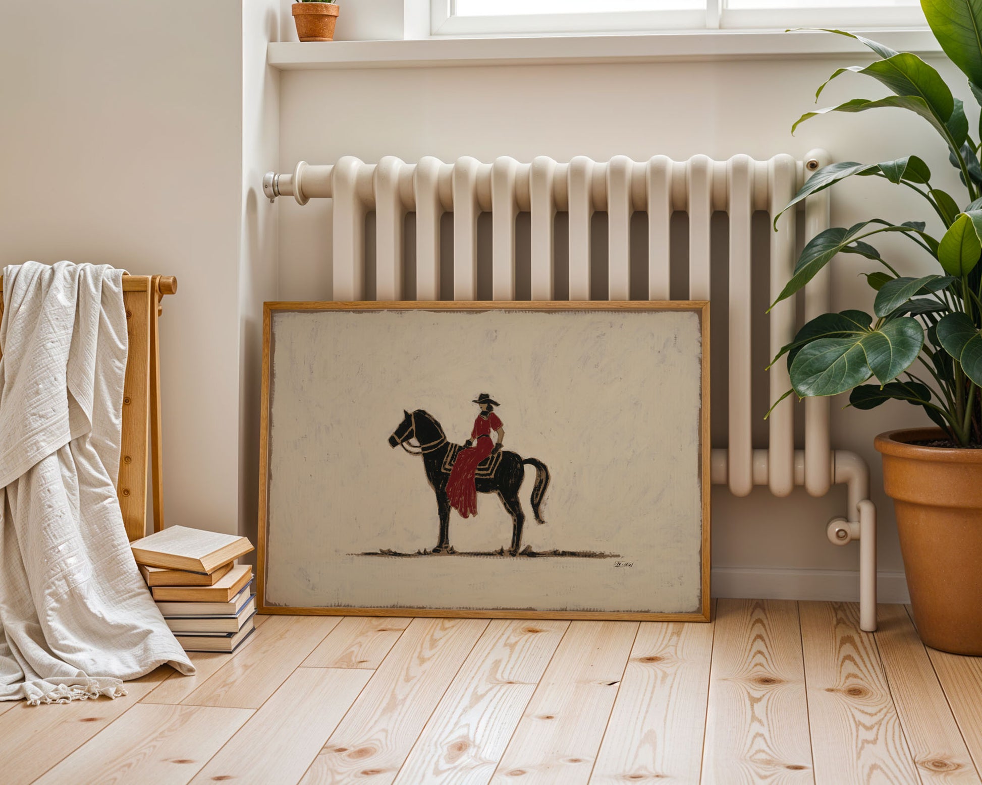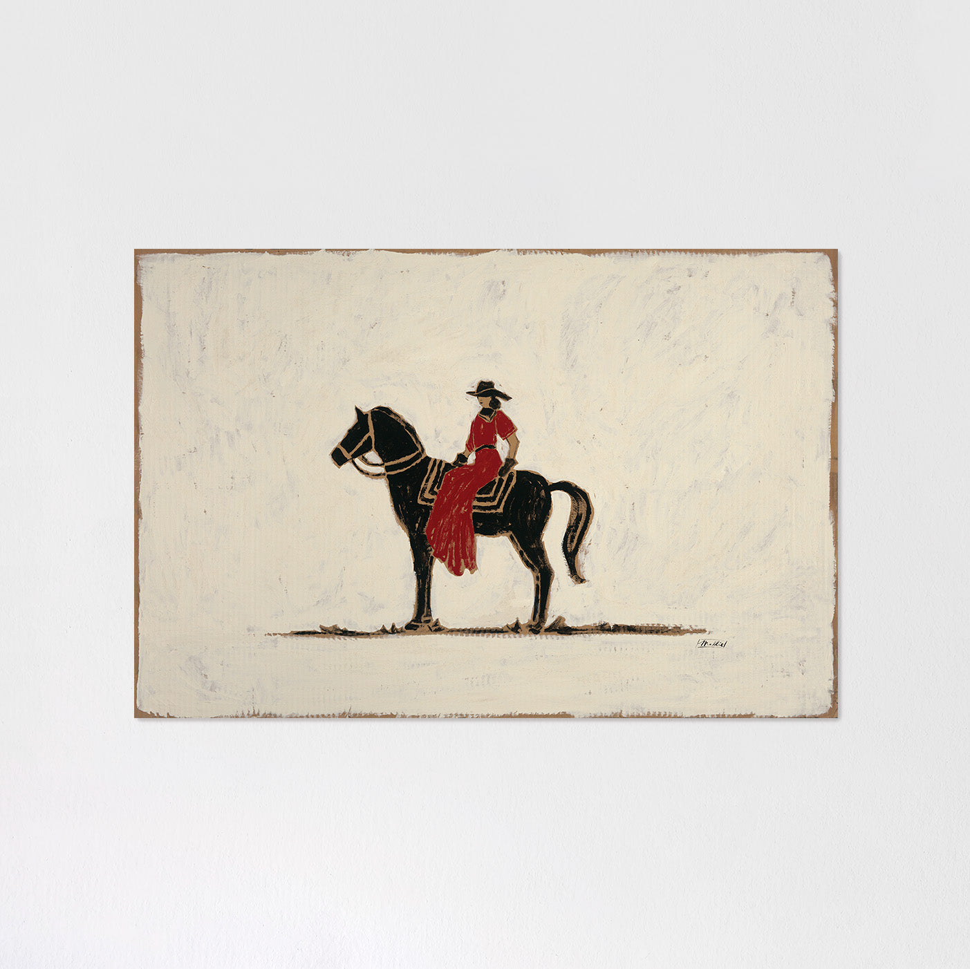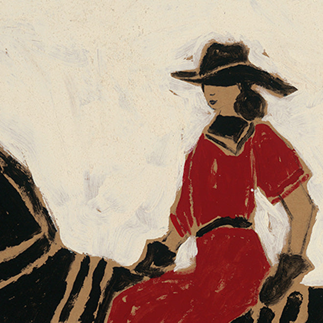 Set against a creamy white background, Into the Night She Goes captures a striking contrast: a bold black horse moving forward with purpose, carrying a woman dressed in red. The simplicity of the palette amplifies the story: light against dark, stillness against motion, restraint against courage.