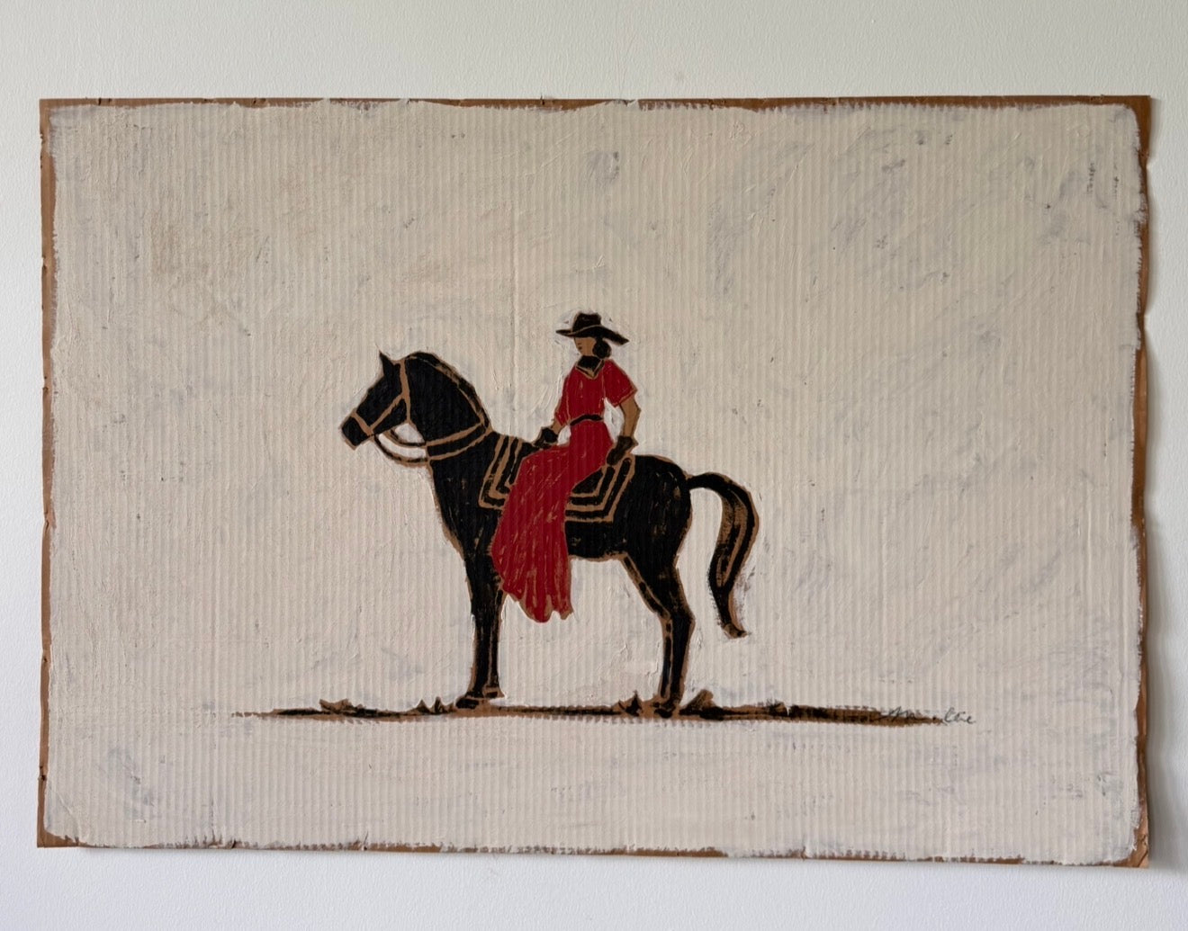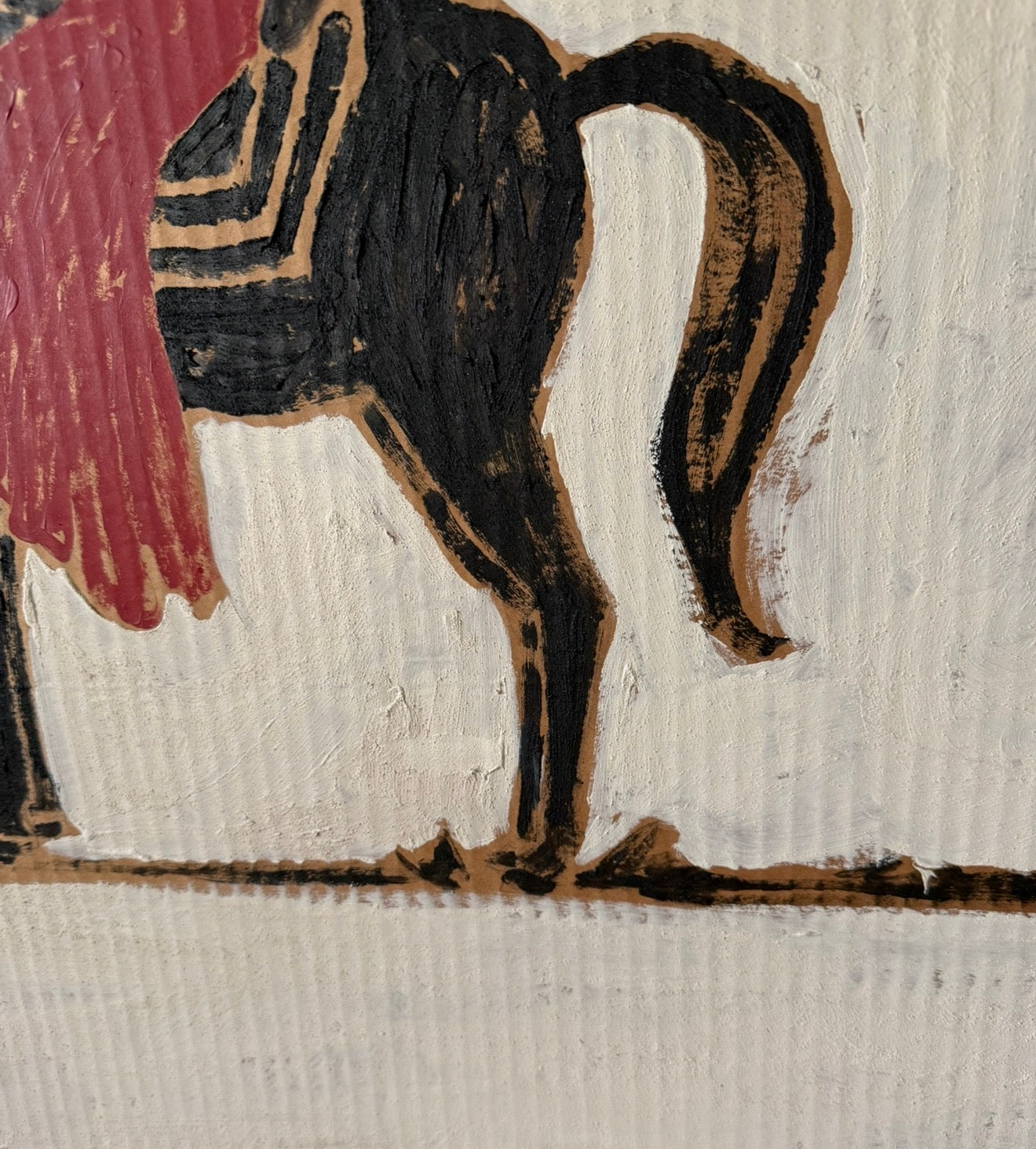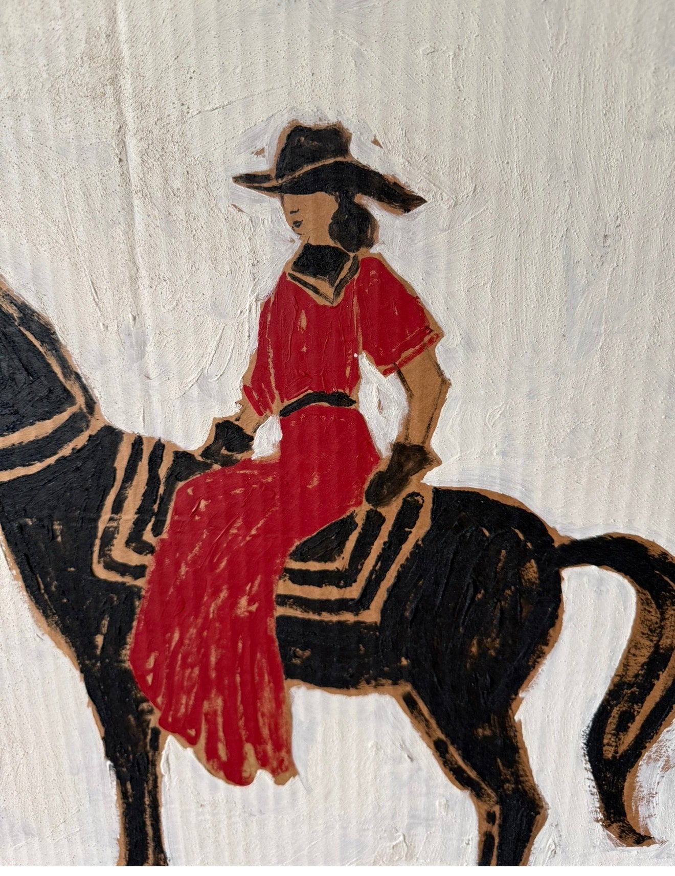 Set against a creamy white background, Into the Night She Goes captures a striking contrast: a bold black horse moving forward with purpose, carrying a woman dressed in red. The simplicity of the palette amplifies the story: light against dark, stillness against motion, restraint against courage.