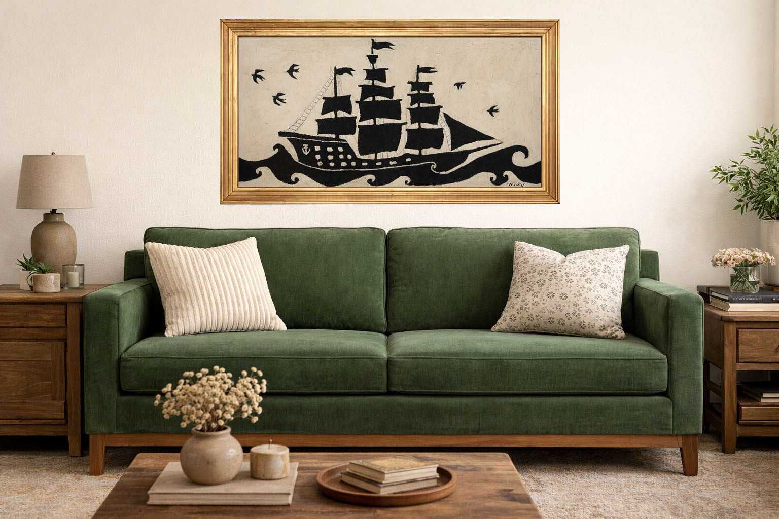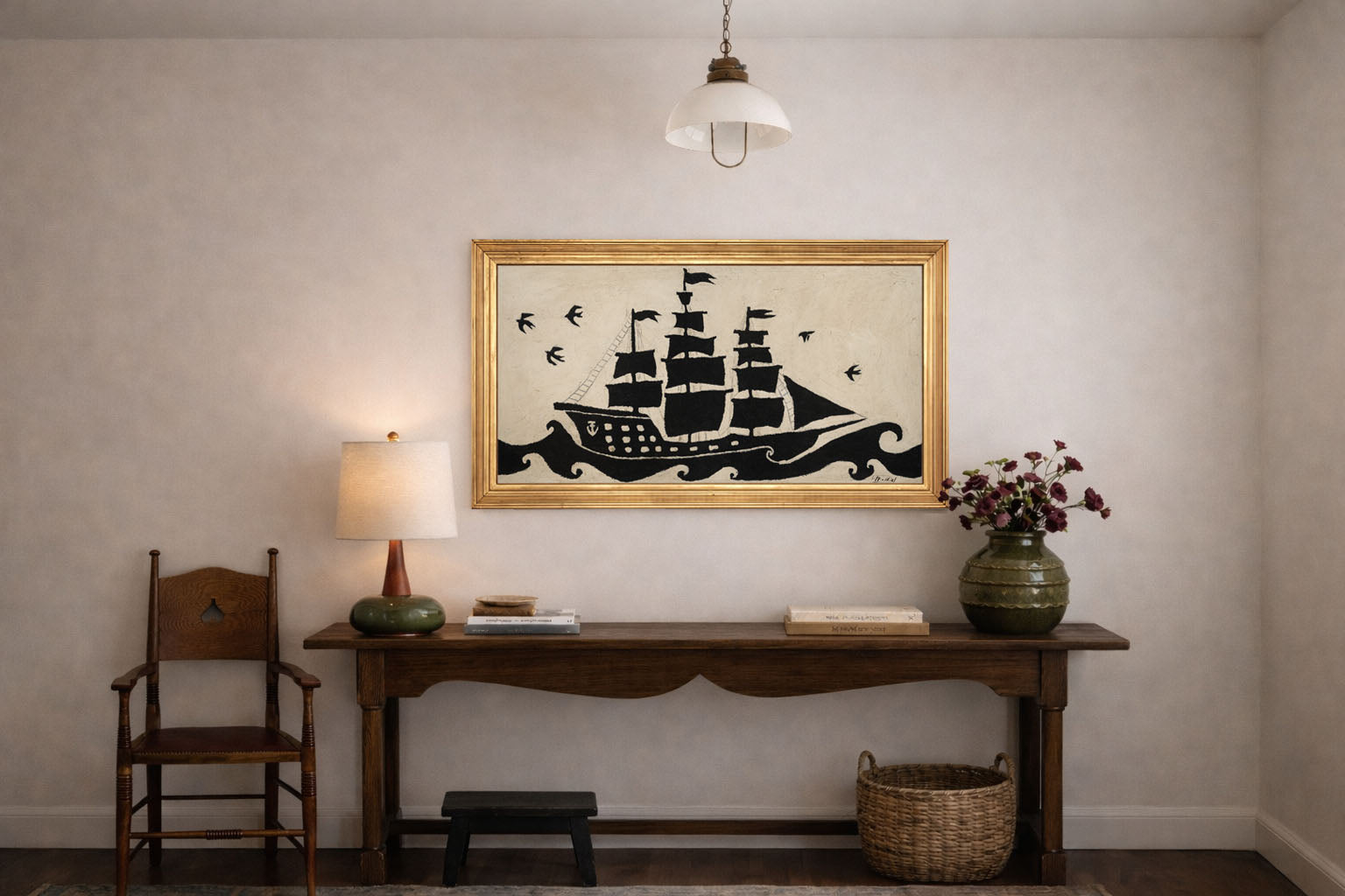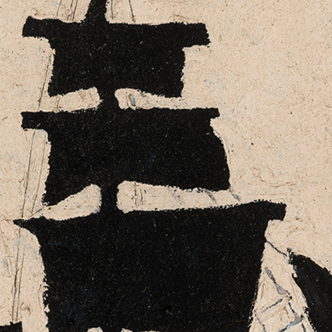 Modeled after the historic Lady Washington, a beloved local vessel, this piece honors the spirit of maritime history in our region. The simplified palette strips the ship down to its essence, allowing form, balance, and symbolism to take center stage. The waves—dark and light—represent the push and pull of time, the known and the unknown, the calm and the unruly seas that every journey must cross.