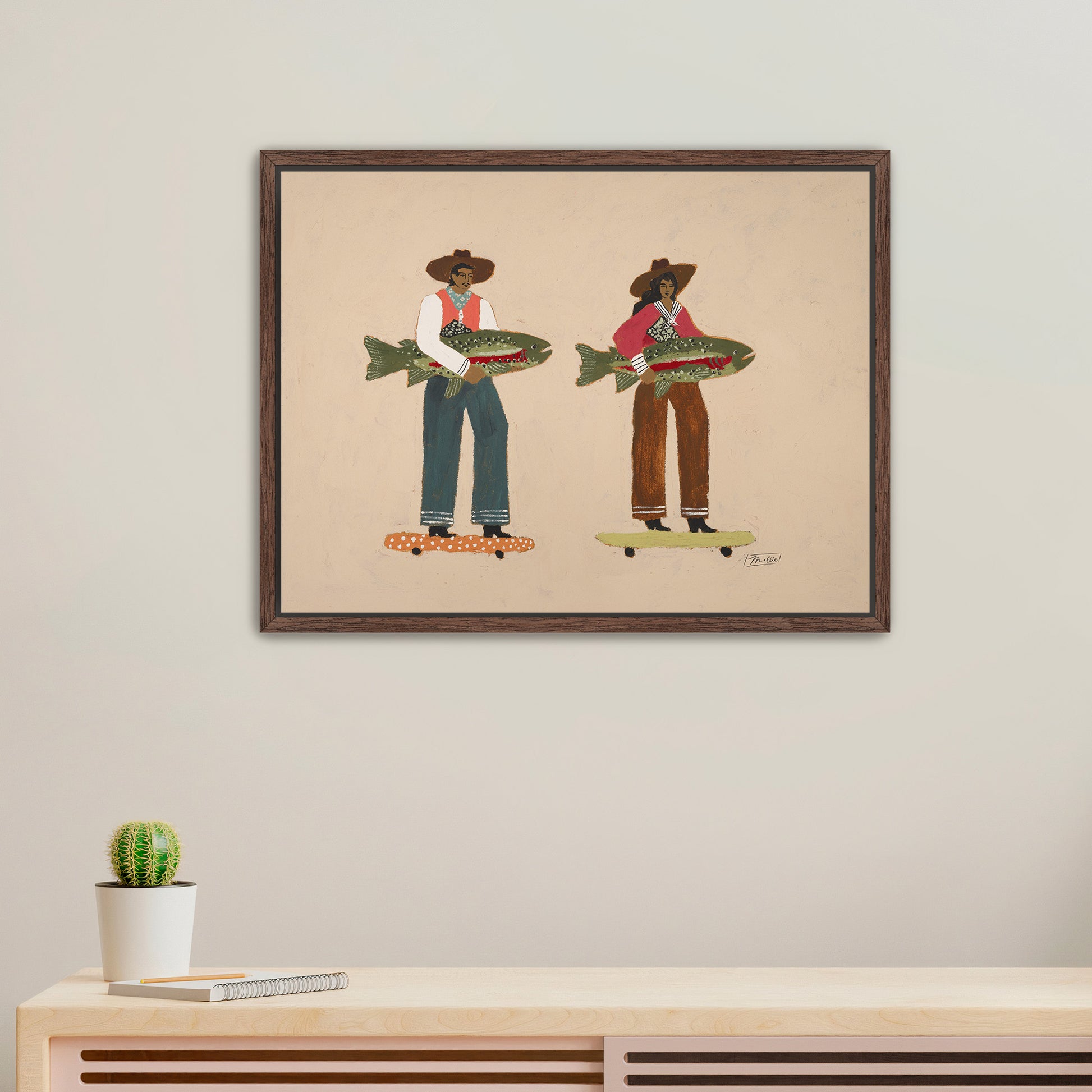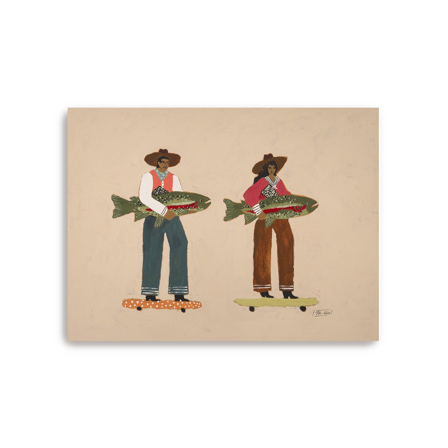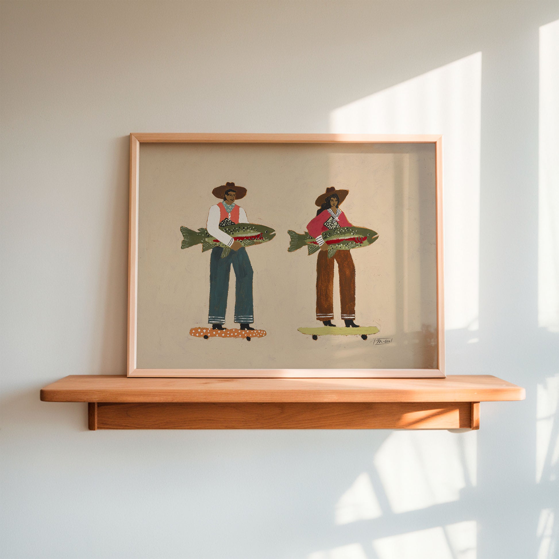 A couple holding a trout, floating through life on their skateboards, adventuring, rebelling, and doing it all side by side.