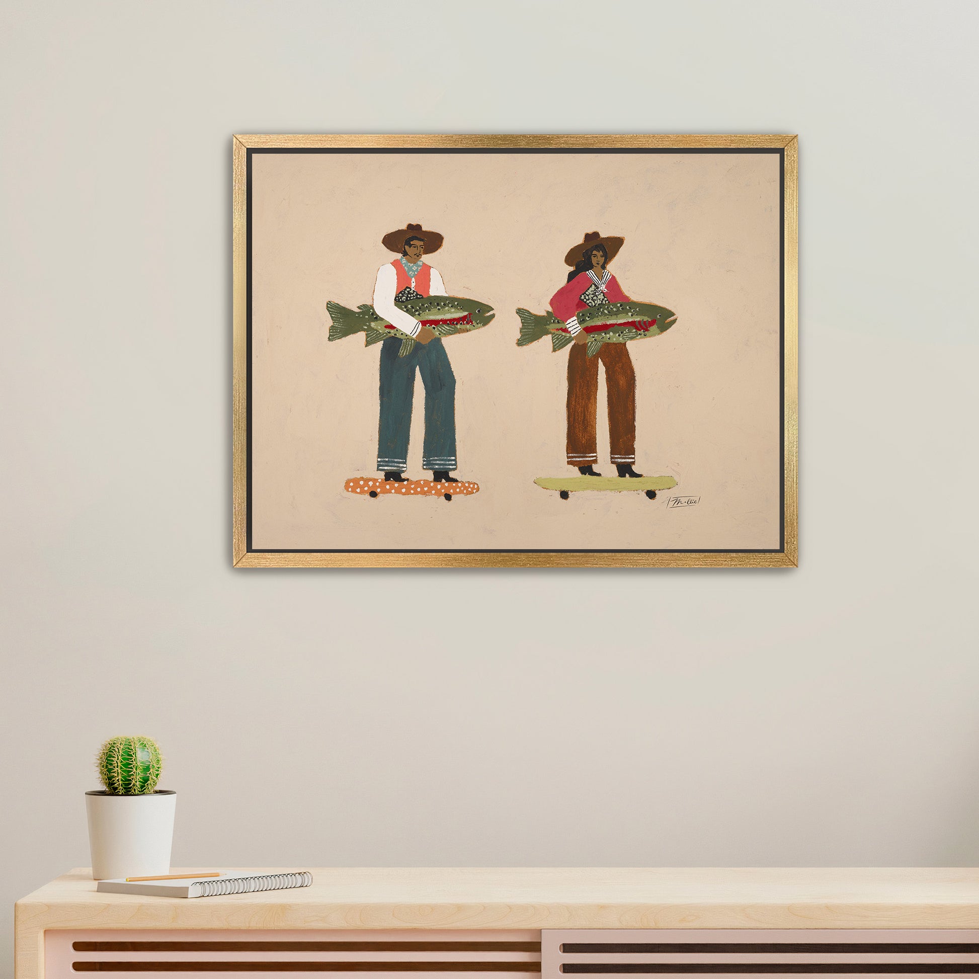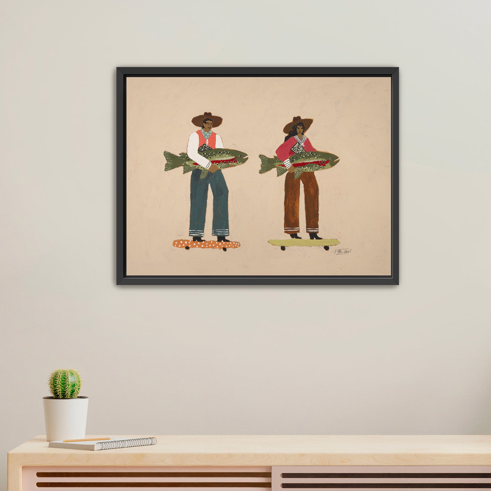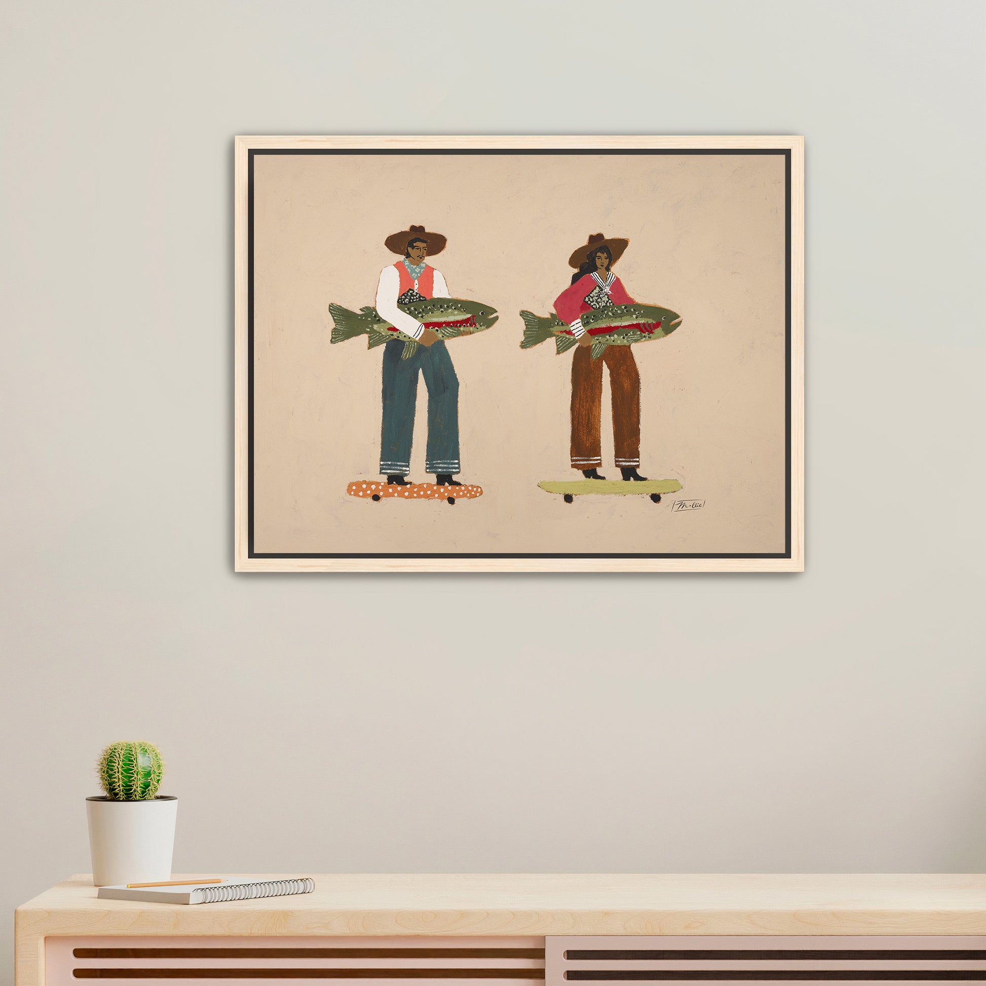 A couple holding a trout, floating through life on their skateboards, adventuring, rebelling, and doing it all side by side.