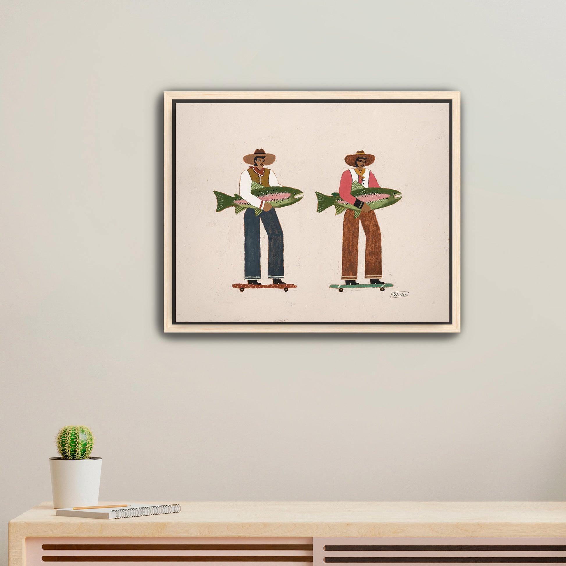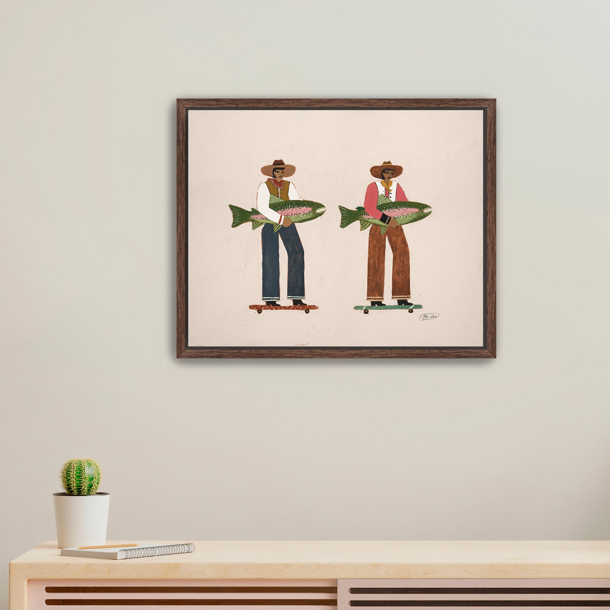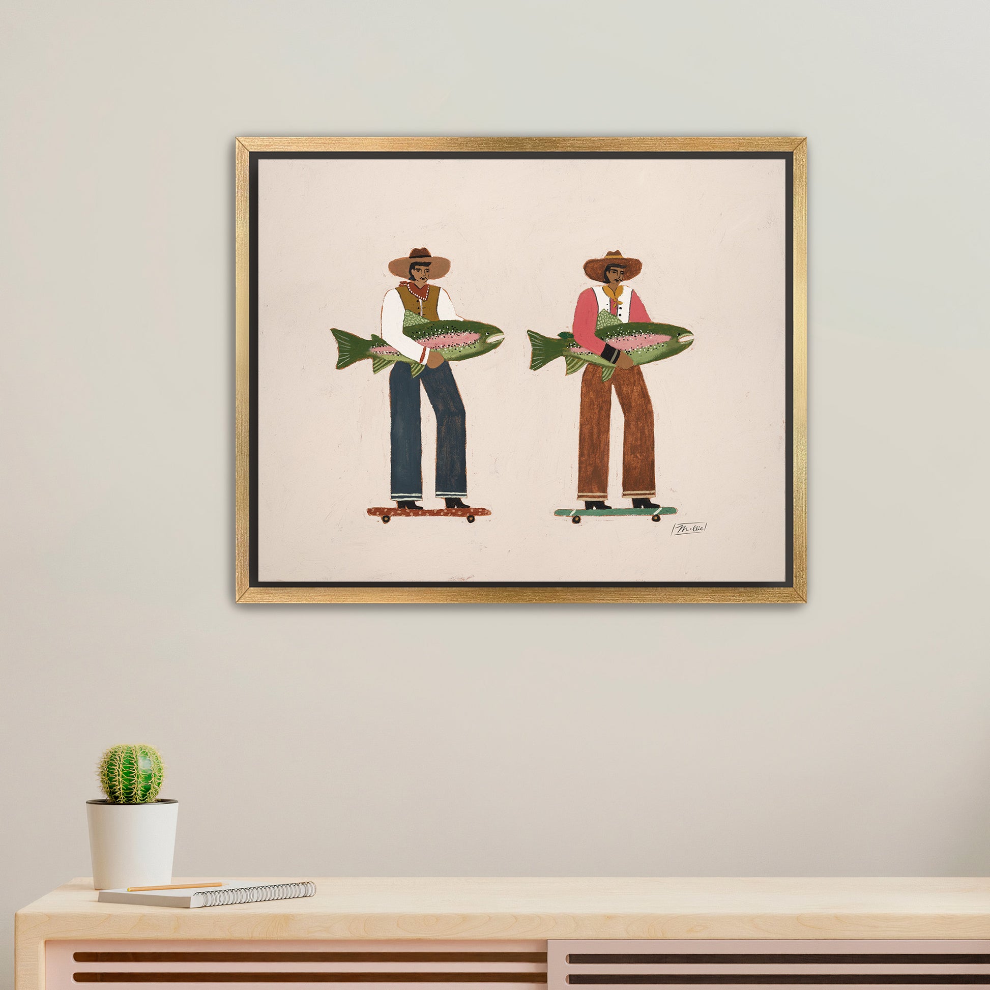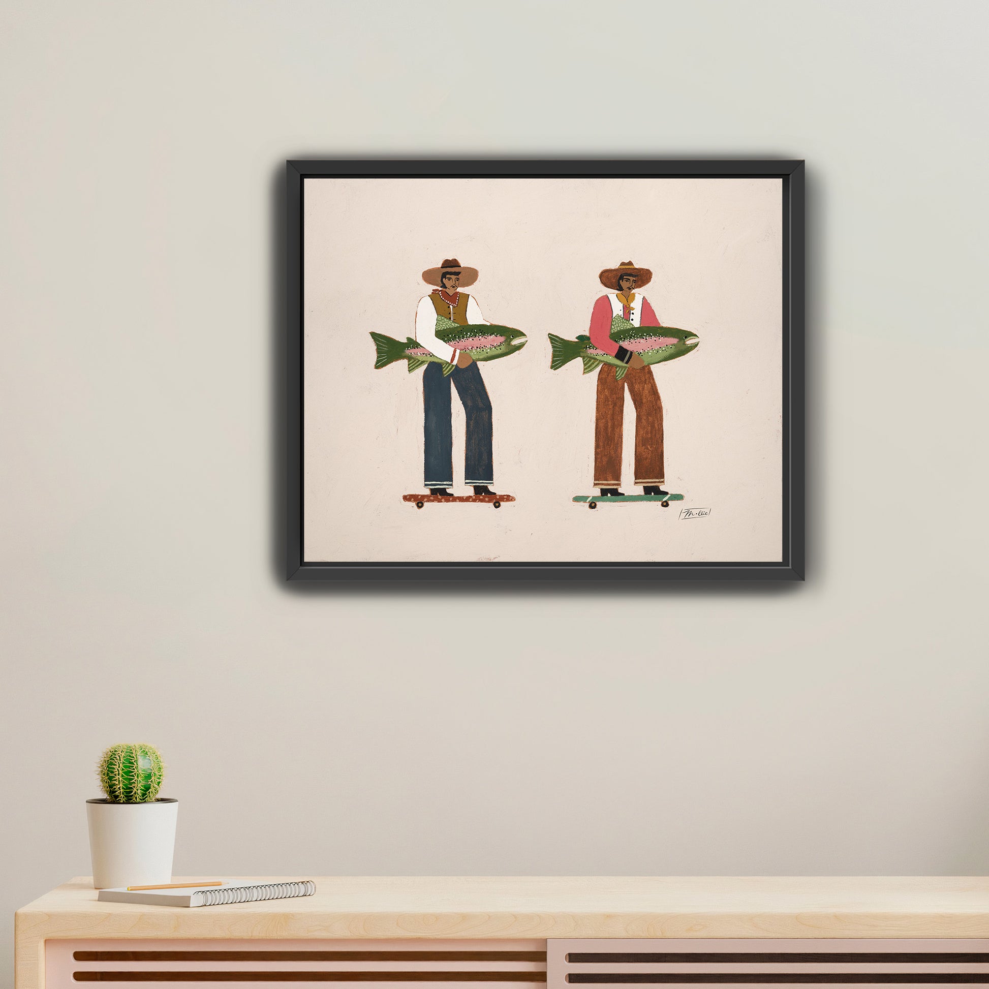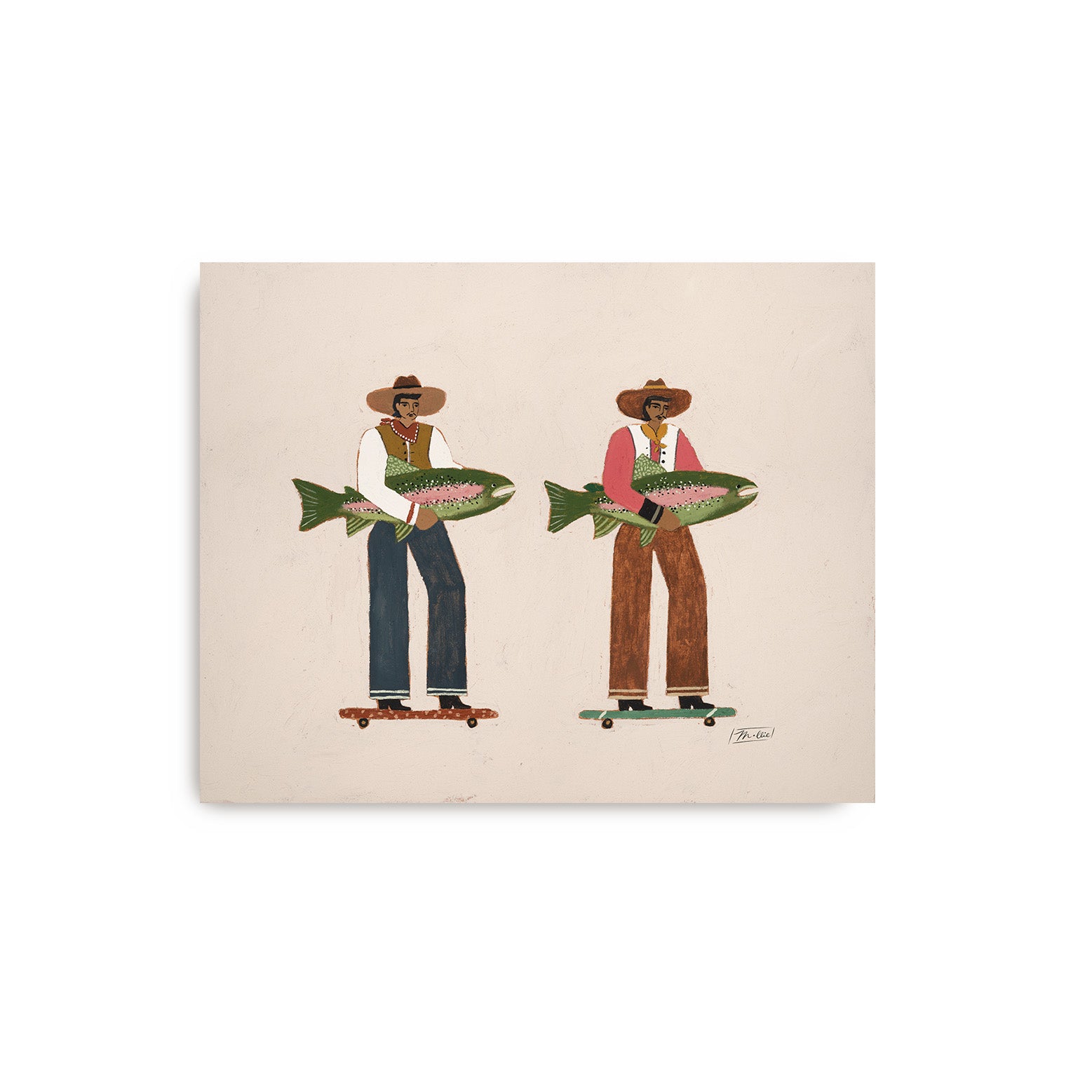 Surf & Turf celebrates the wild ride of life, two men rolling forward with effortless ease, their catches in hand and the open road ahead. It’s a nod to momentum, motion, and moving through this world side by side. A blend of grit, humor, and coastal charm, this piece captures the feeling of charting your own course while staying connected to what grounds you.