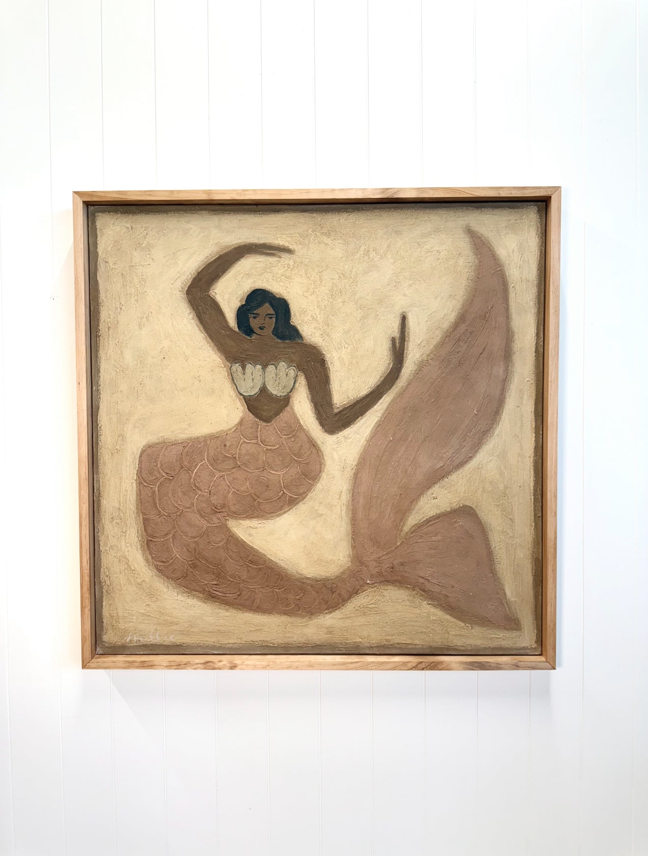 A companion to Tales of the Pink Sea I, this mermaid mirrors her sister in strength and serenity. Confident and kind, she is a reminder of feminine power and peace. Soft and sunlit, the creamy sea feels like a quiet morning after a storm. The mermaid’s pink tail brings playfulness and confidence, grounded by warmth and nostalgia of days past.