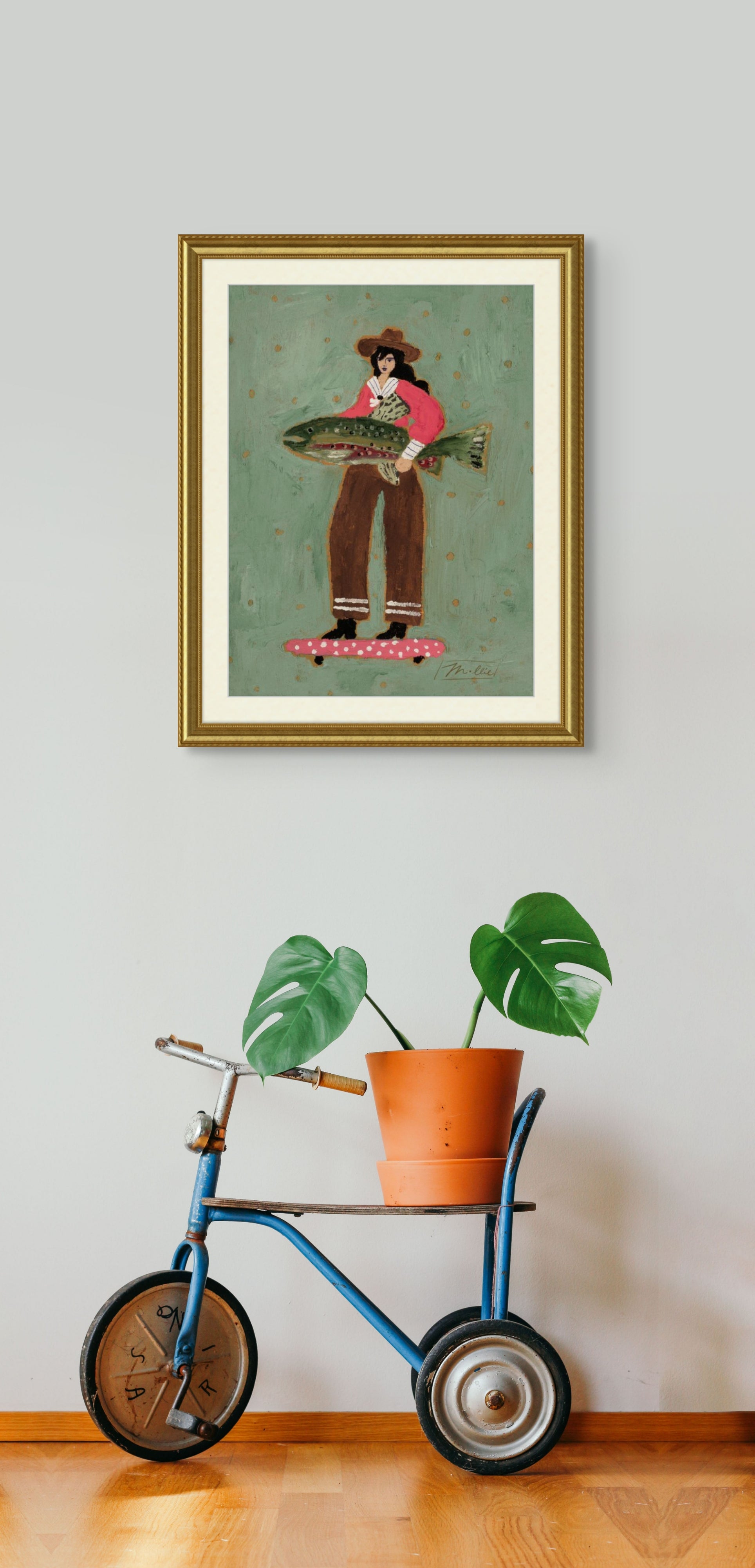 This little lady — boots, hat, fish, skateboard and all — is the very definition of balance and spirit. She does it all, and she does it in style.